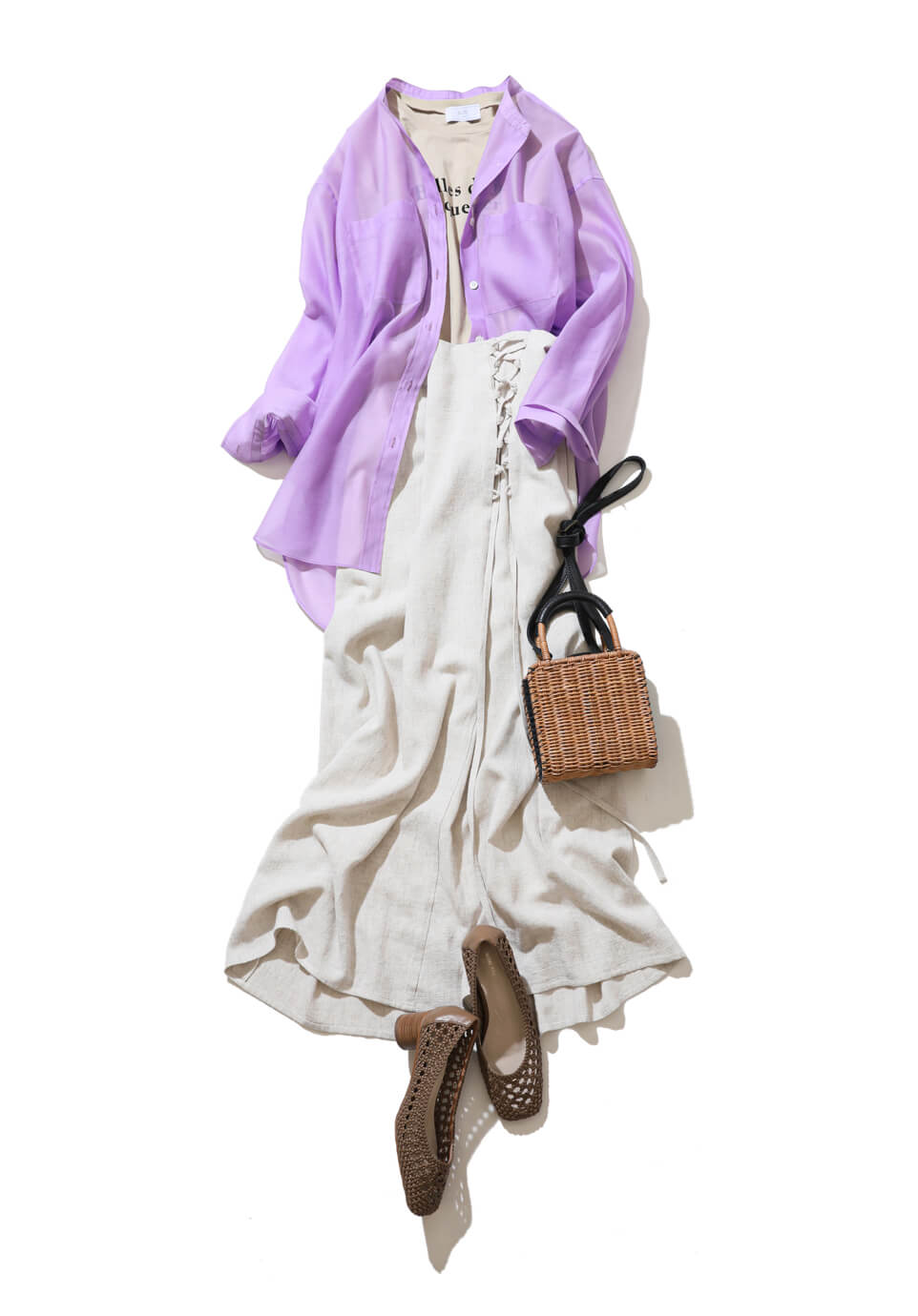 ロゴTに合わせたボトムスは、レースの編み上げデザインがお気に入りのリネンマキシスカートと夏素材の小物たち。この組み合わせでも十分垢抜けられるけど、オンライン会議を控えている今日は上半身にさらに華やぎを加えたい。そんな時はシアー素材シャツをふんわり羽織るだけで、トレンド感が急上昇。