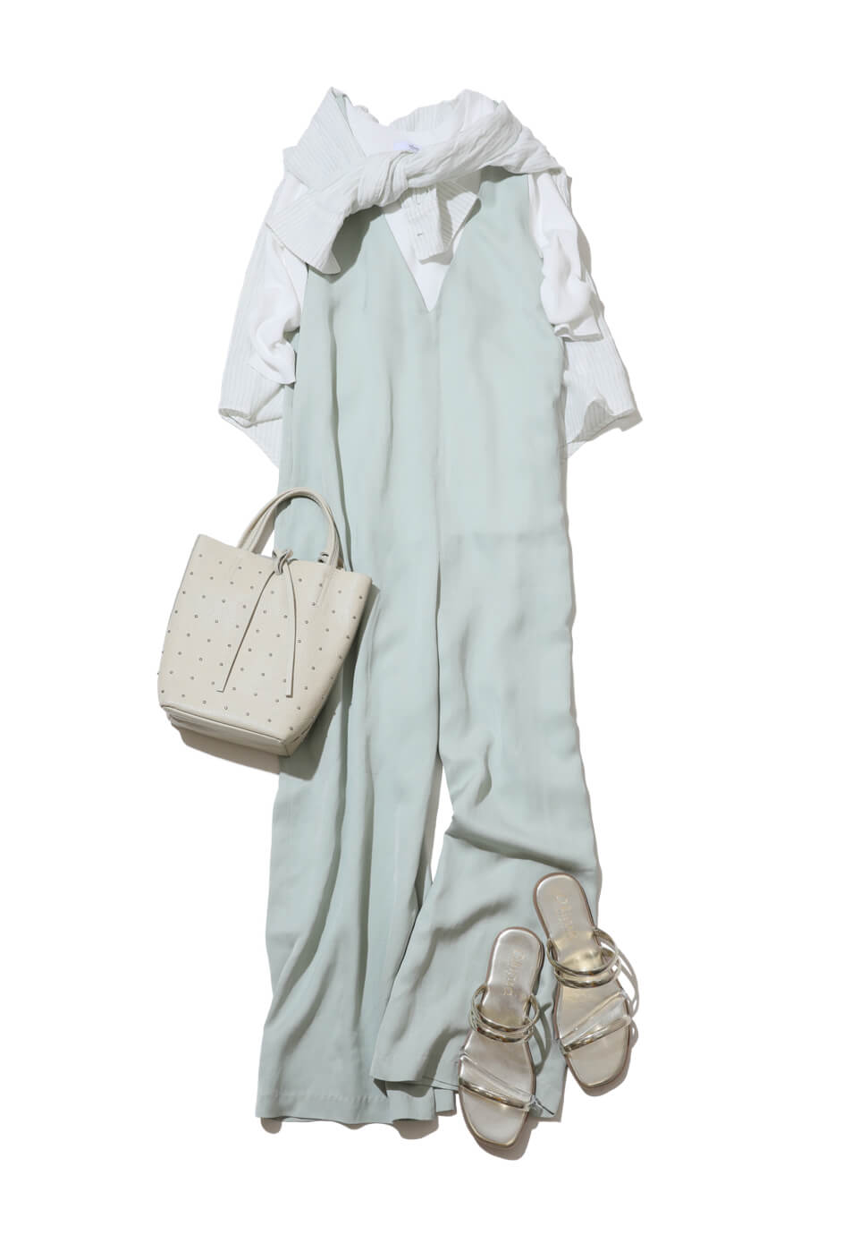 ストレスフリーに楽々コーデが決まるサロペット。マカロンのような淡いグリーンが新鮮な印象に。合わせたトップスとシャツはピュアな白で、バッグ&シューズはニュアンスのあるベージュとゴールドで合わせることで洗練の雰囲気を高めて。細かいスタッズ付きのバッグとPVCコンビサンダルが艶感をプラス。