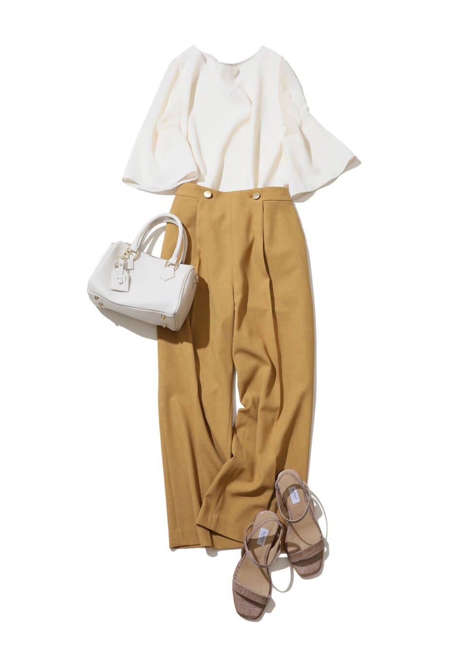 Vネックのスッキリしたデコルテと透け素材に切り替えた袖、裾のフレア。1枚で女っぽさがたっぷり香るブラウスで上品なムード。フロントのボタンとタックがポイントのボトムスを合わせた、今っぽいゆるさを醸すオンのスタイルで久々のオフィスへ。ころんとした白のミニボストンを携えて爽やかに。