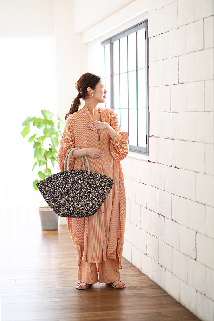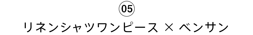 - シンプルなリネンのシャツワンピースには人気のベンサンを合わせてトレンド感をプラス。ゴールドビットがついているのでカジュアルになり過ぎず、ちょうど良い大人のカジュアルスタイルに。
