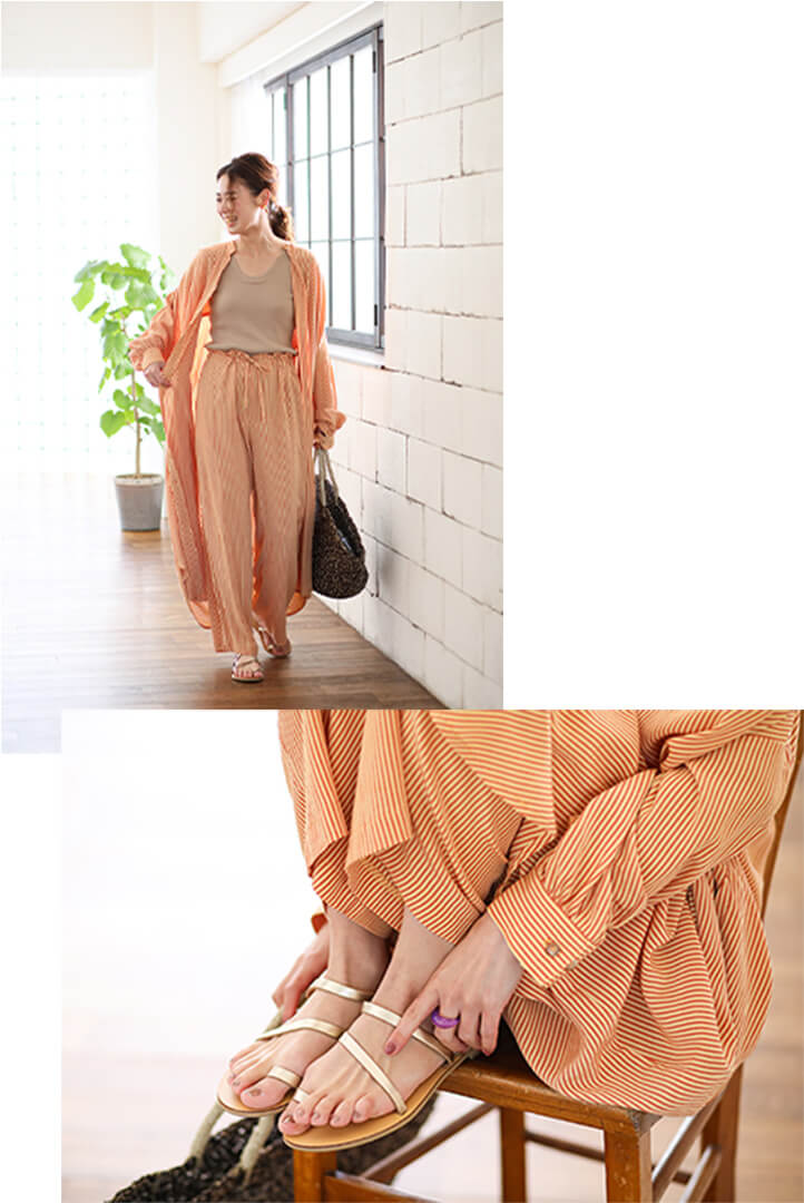 ゴールドの華奢なストラップサンダルならばどちらのスタイルにもマッチします。