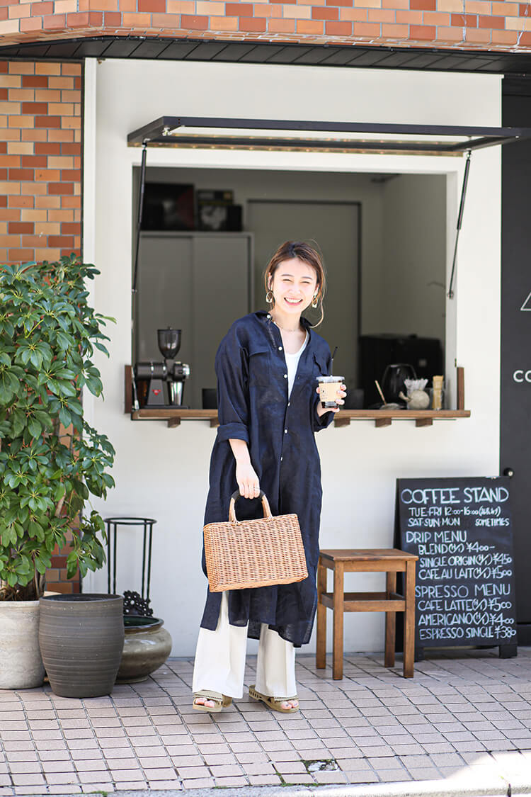 - ゆるめのシルエットのシャツワンピースはボタンを開けるとカジュアルな印象に、閉めるとレディな印象に。