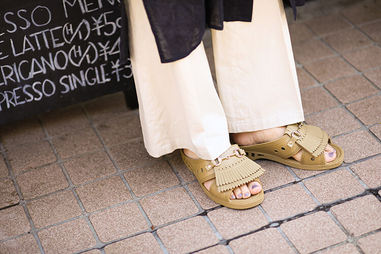 落ち着いたカラーなので大人っぽく着こなせます。1足は持っておきたいスポーツサンダルはスェード素材のアッパーが珍しいrelume別注のSUICOKEで周りに差をつけて。