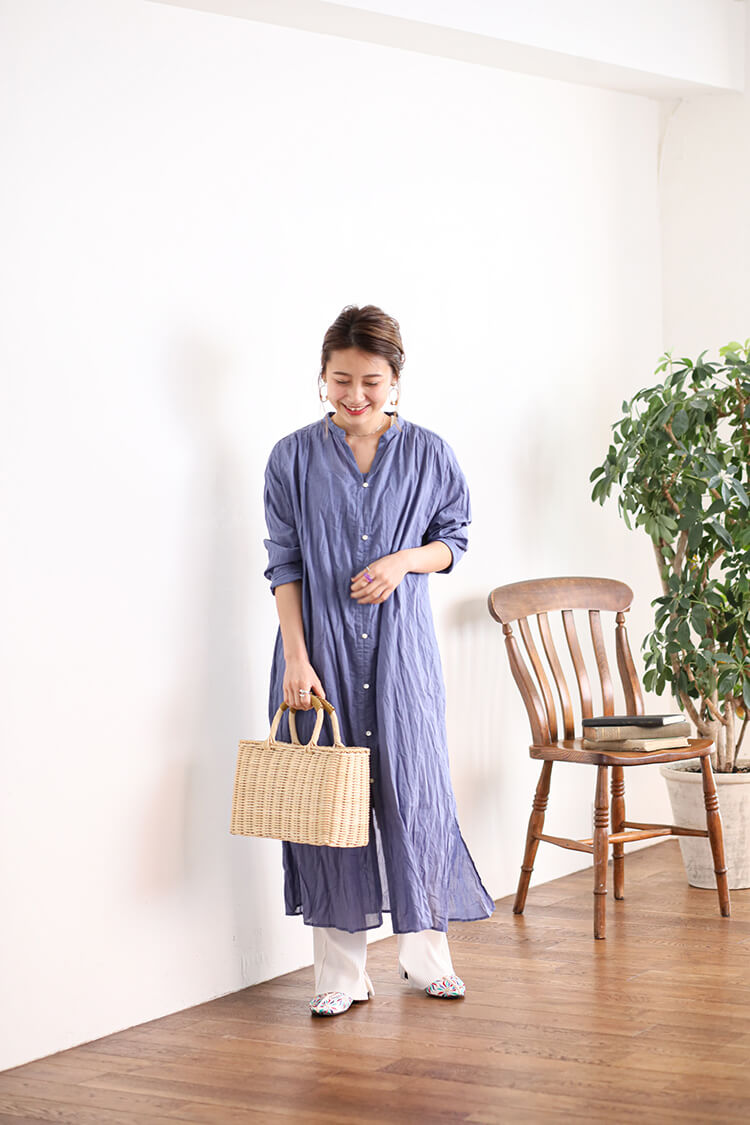 - 肌馴染みの良いくすみブルーのワンピースはホワイトのパンツとチャイナシューズを合わせてクリーンな印象のコーディネートに。シワ加工が施されたワンピースは座りジワが気にならないのでリラックスタイムに◎