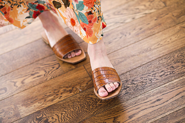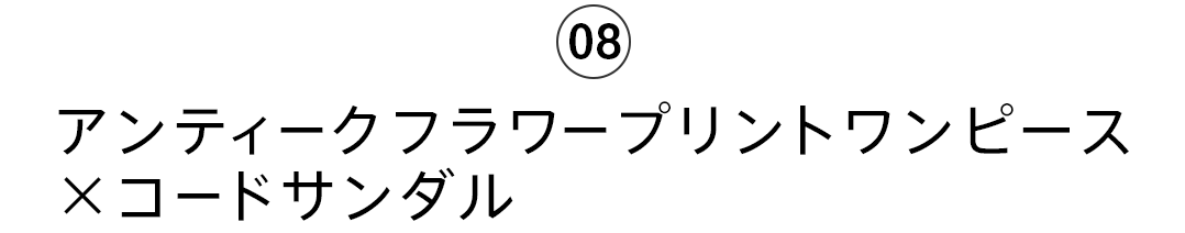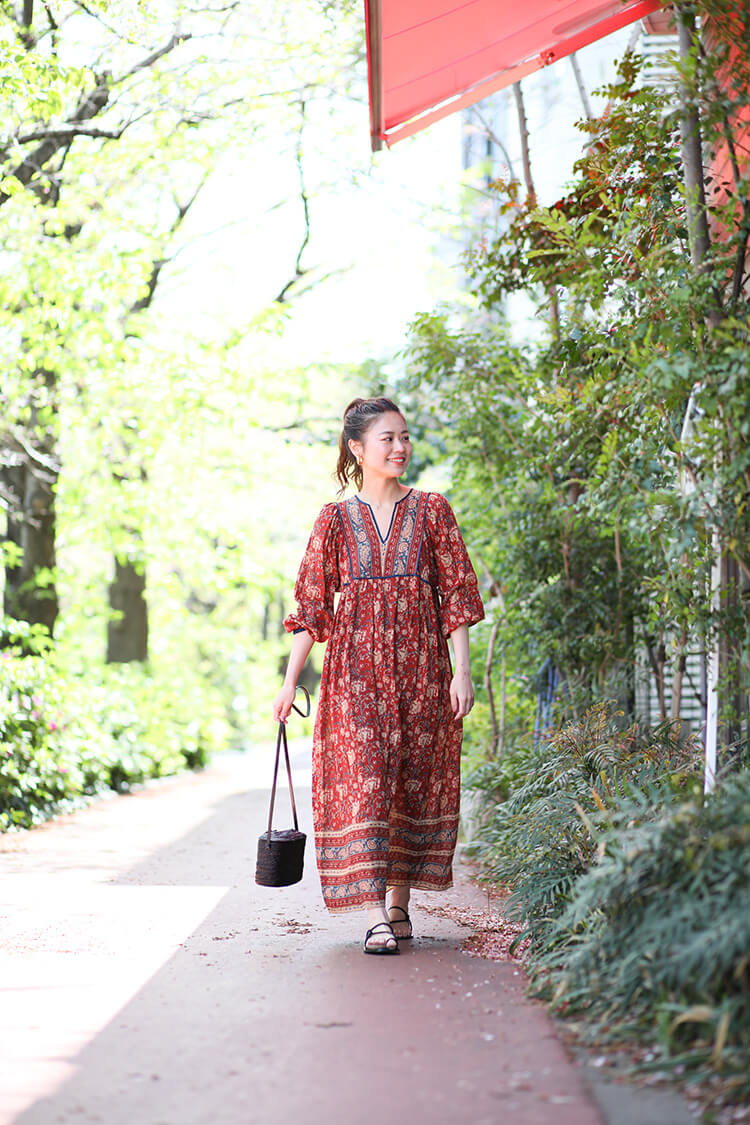 - ヴィンテージ感漂うレトロな柄のワンピースにクロコ型押しサンダルを合わせた大人リゾートスタイル。リブパンツをレイヤーすれば花柄も甘くなり過ぎず、カジュアル派の方にもおススメのスタイルです。
