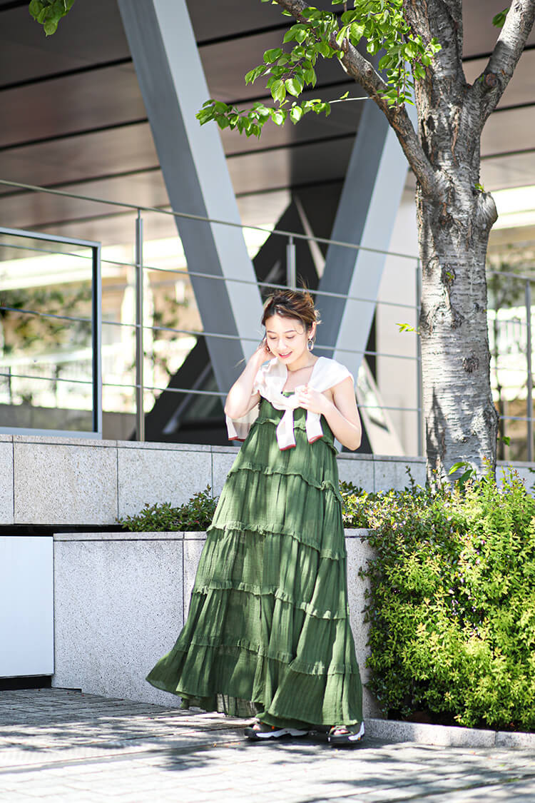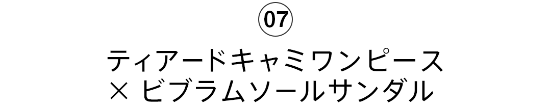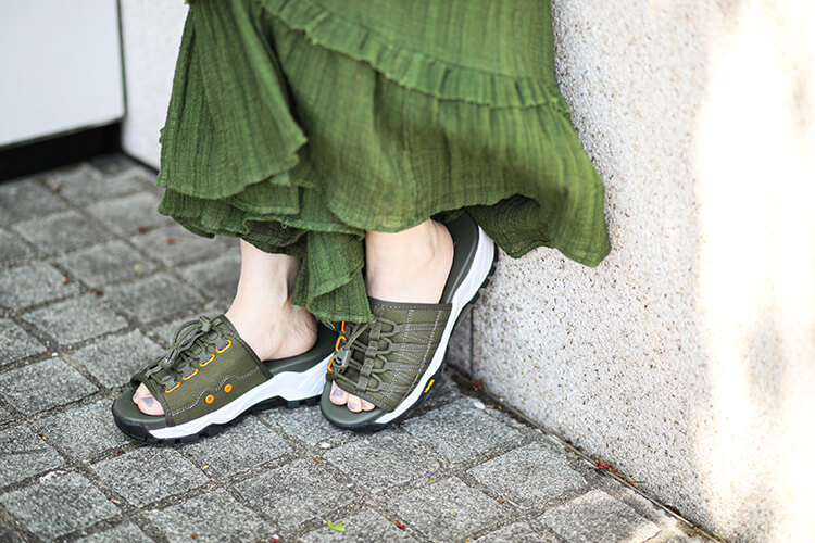 - ボリュームたっぷりのティアードが可愛いキャミワンピースには、同色のビブラムソールのスポーティなサンダルを合わせてトーンオントーンのテイストミックスコーデに。