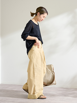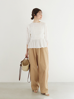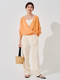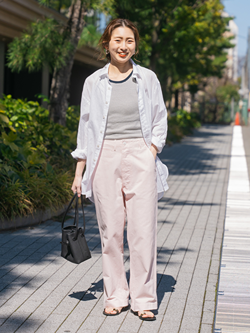 スタイリッシュに取り入れてSpick & SpanのMoeriの夏パンツコーデに注目。淡いピンクのチノパンツを、上品なホワイトリネンシャツと合わせて爽やかな大人カジュアルに昇華。ベージュパンツは甘ブラウスやオレンジカーデとつないで甘辛MIXするのが◎。
