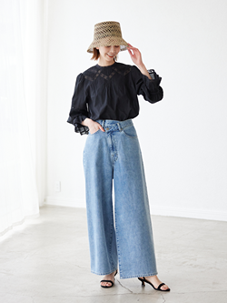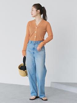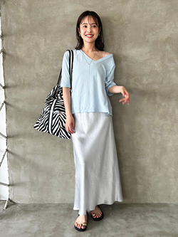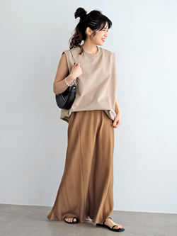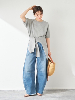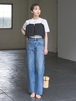 セットで楽しむ引き続きトレンドのデニムは、全体を軽やかに仕上げてくれる夏小物とのスタイリングがグッドバランス。NOBLEのRinaはTシャツ×キャミソールの最旬レイヤードが映えつつ、ころんとした愛らしいフォルムのカゴショルダーをアクセントに。