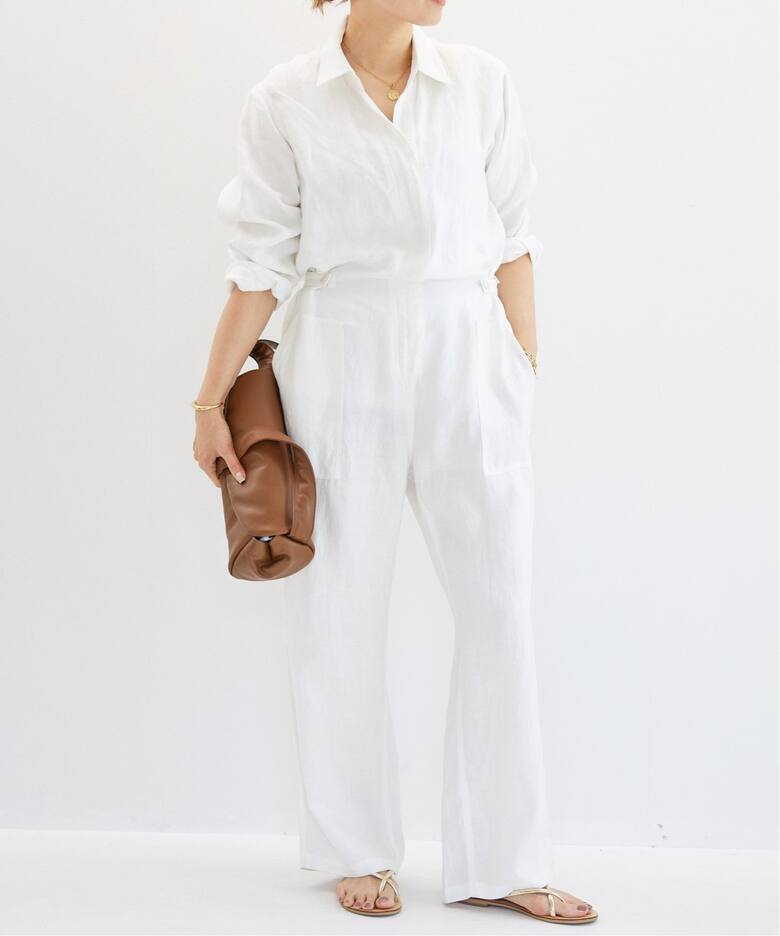 快適なゆるめオールインワンが便利体が泳ぐオーバーサイズのオールインワンは暑くてジメジメする夏にこそぴったり。ボリュームたっぷりのバギーパンツが目を惹きながらもスキッパー襟がすっきり見えを叶えるFRAMeWORKがお手本。