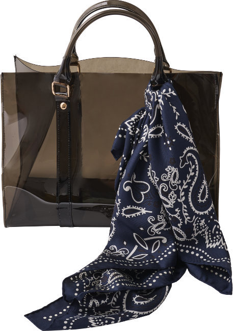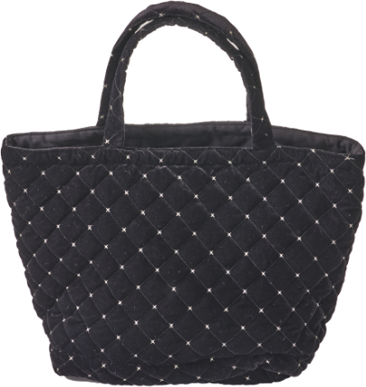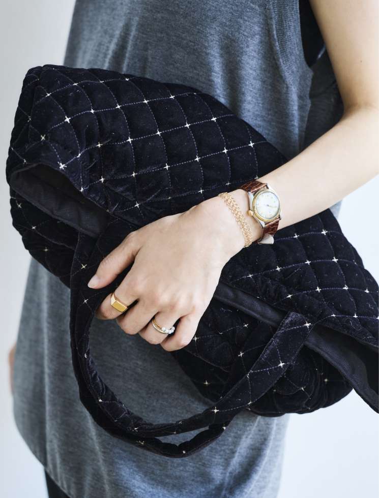 ベロア地に煌めく星のような刺繍が楽しいバッグ。二つ折りにしてクラッチ風に持つとこなれたイメージ。