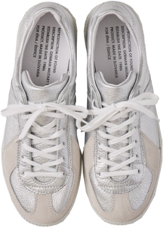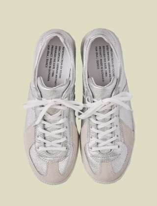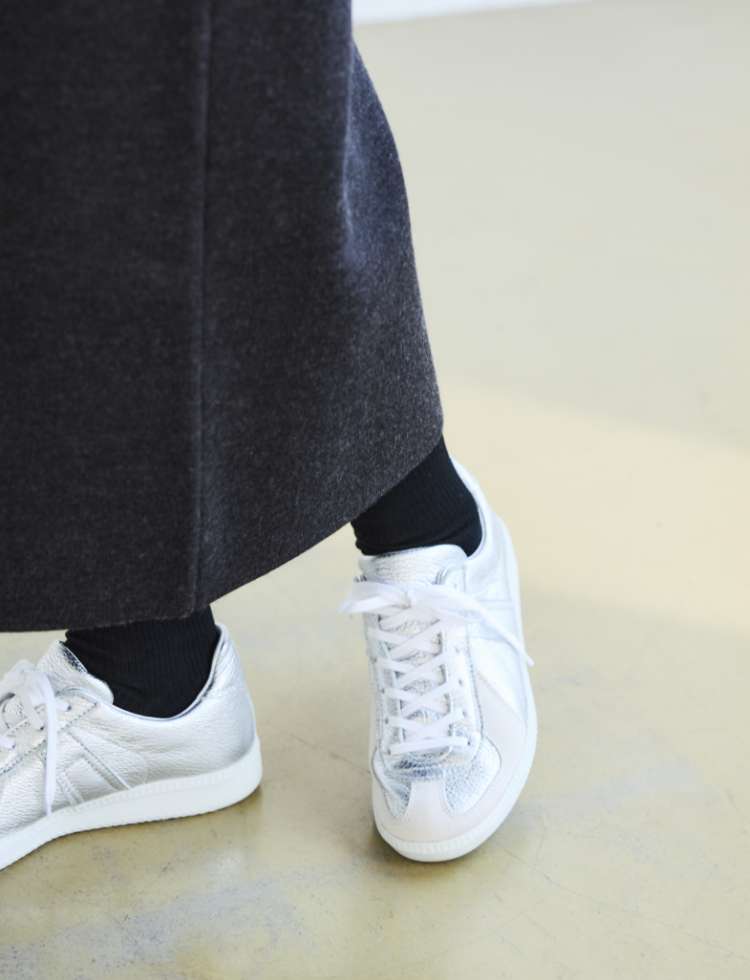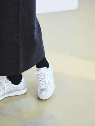 光沢のあるシルバースニーカーで遊び心を加えたオフスタイル。