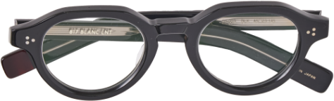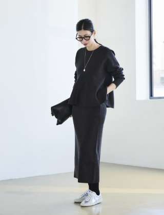 大人シックなセットアップに、ブラックフレームの眼鏡や