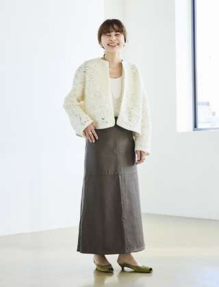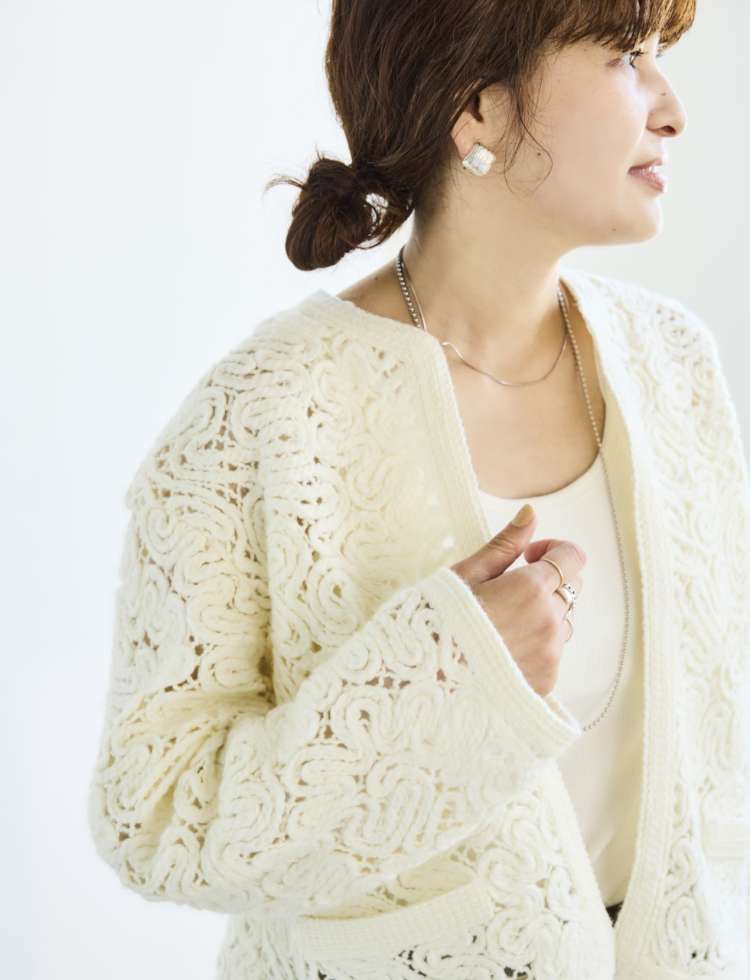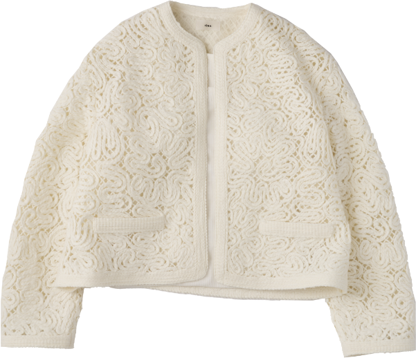 編地に存在感のあるジャケット。ふとした時にちらりと覗く裏地のオーガンジー素材もお気に入りポイント。