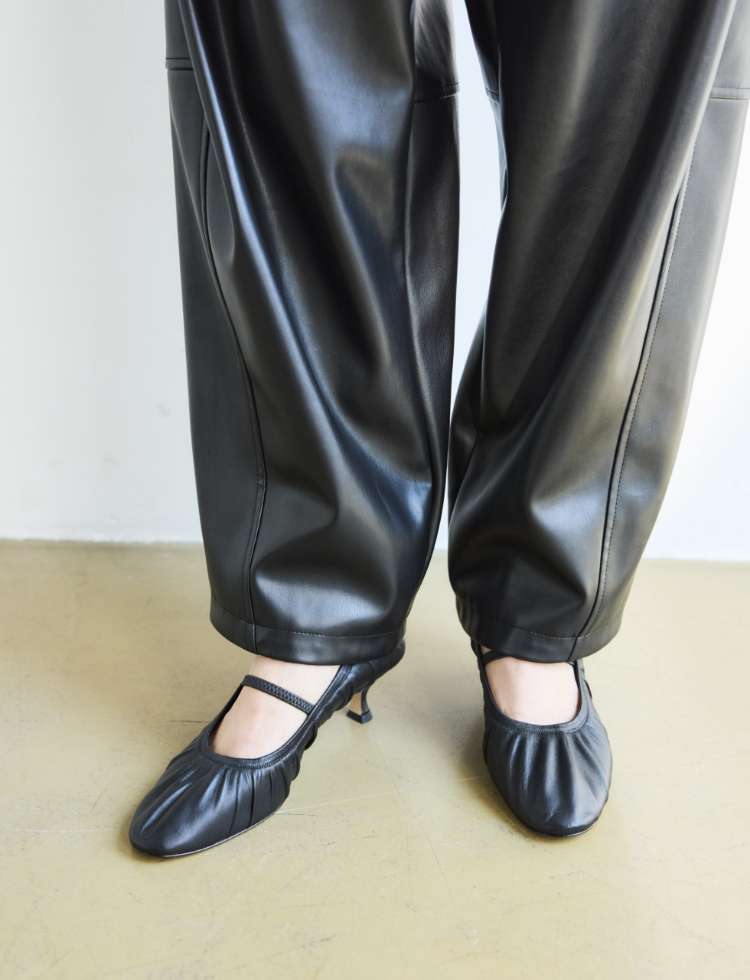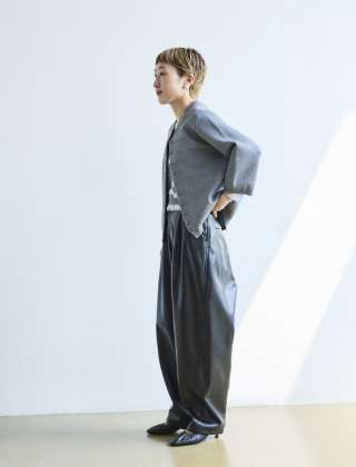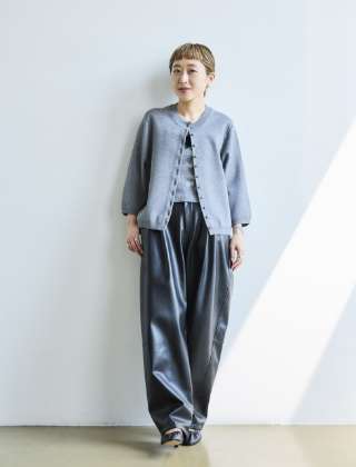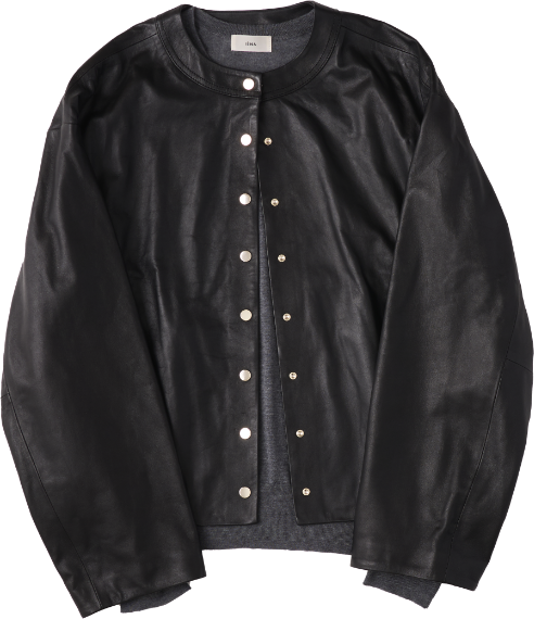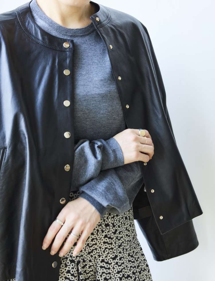 今季マストのレザージャケット。ノーカラーでミニマムなデザインだからカーディガン的にも羽織れてスタイリングも幅広い一枚です。