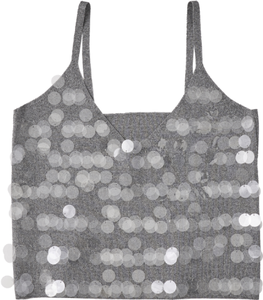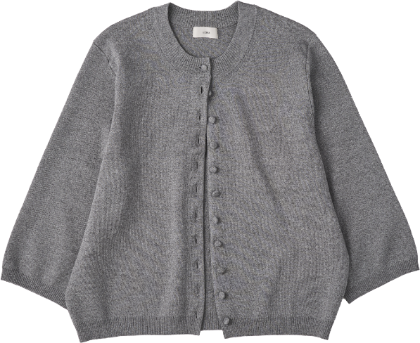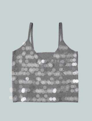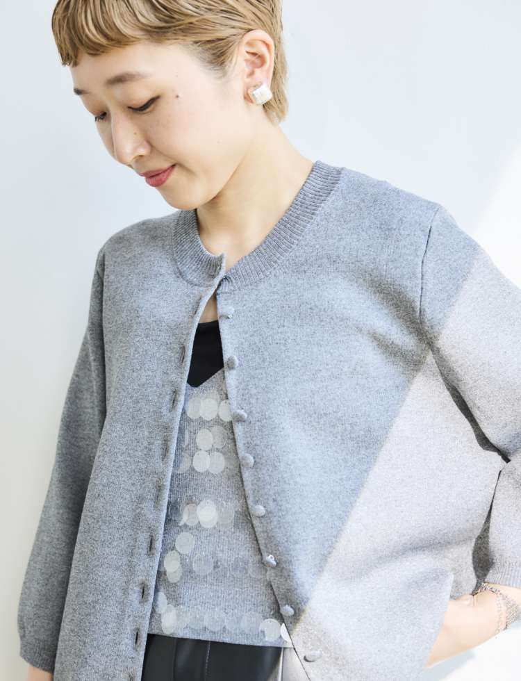 やさしい光沢感とクルミボタンが特徴的なカーディガンにスパンコールのキャミソールを。