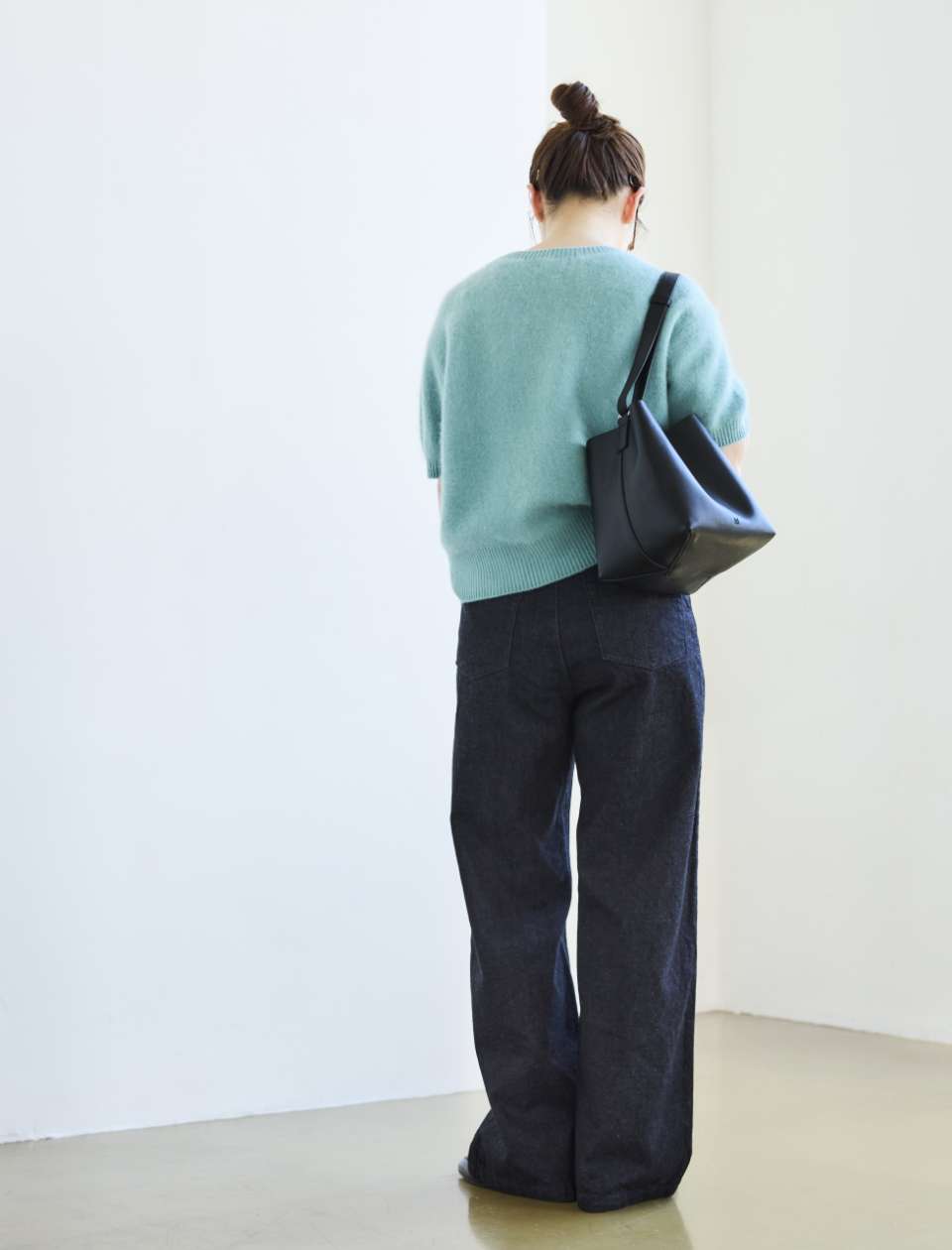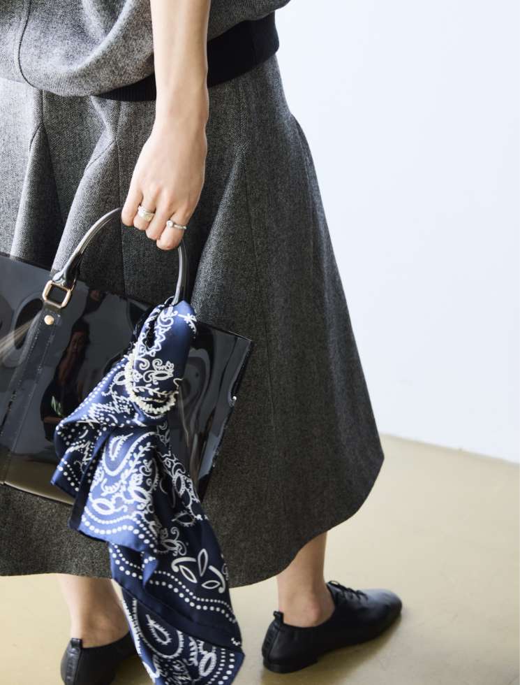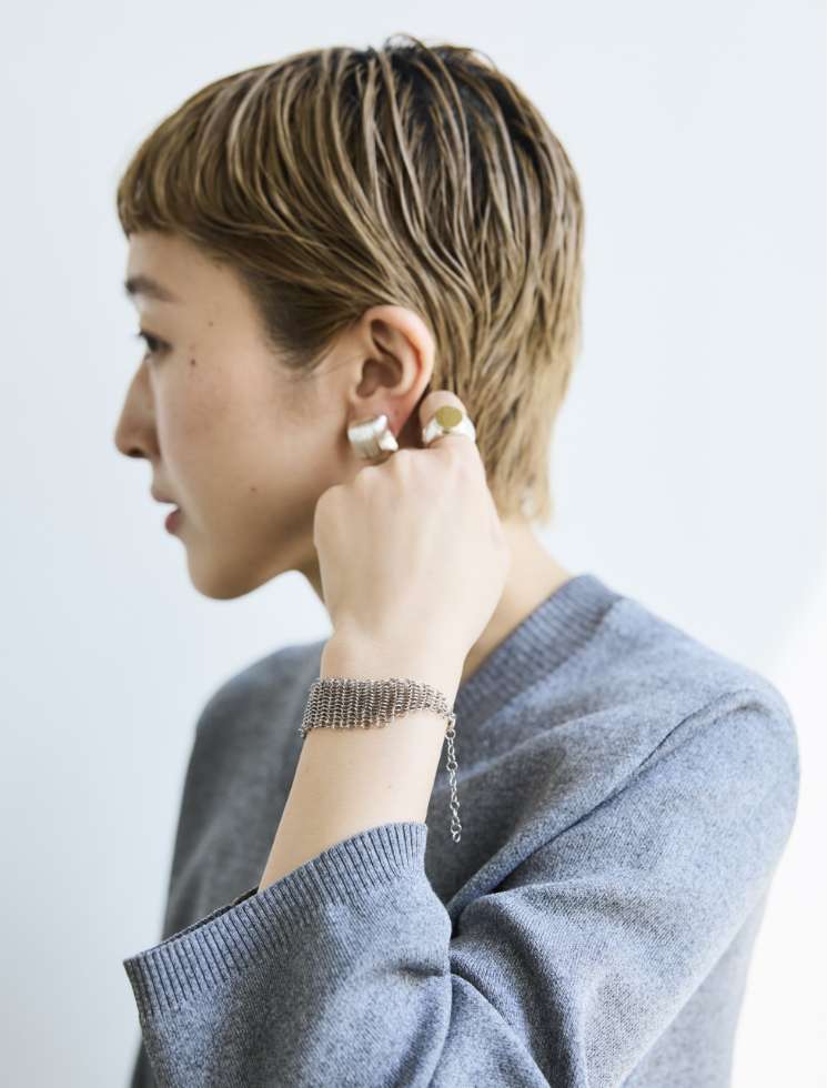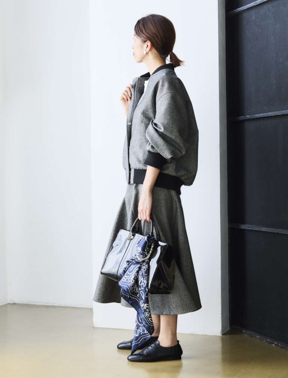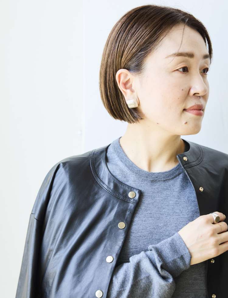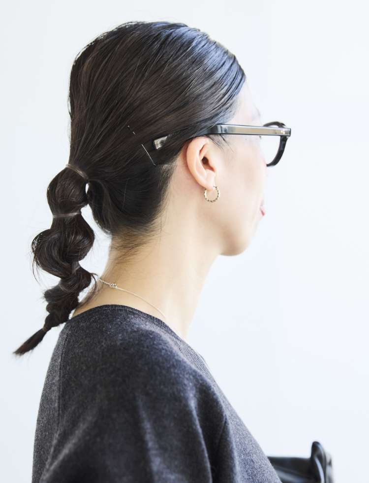 フォルムや存在感のあるアイテムを着るときヘアはスッキリさせつつ、何よりツヤを大切に。