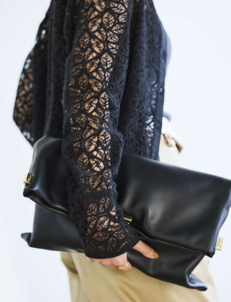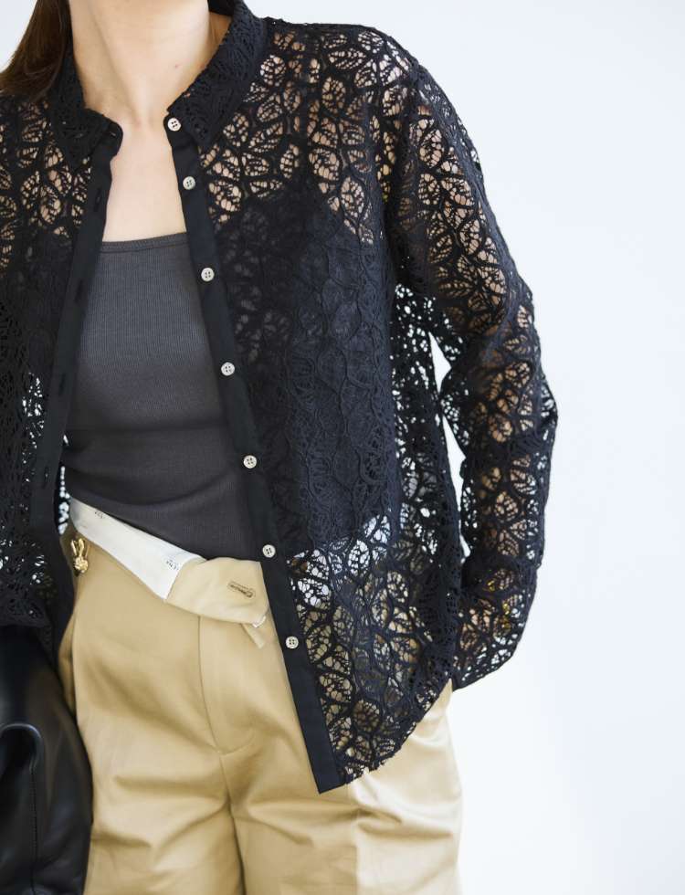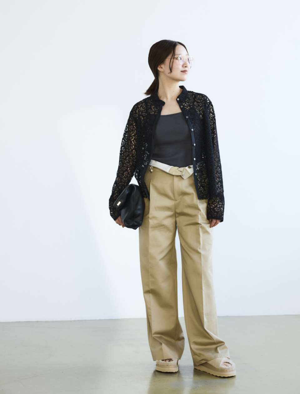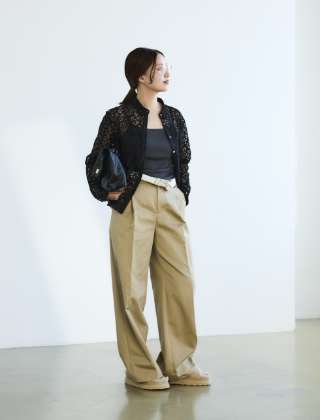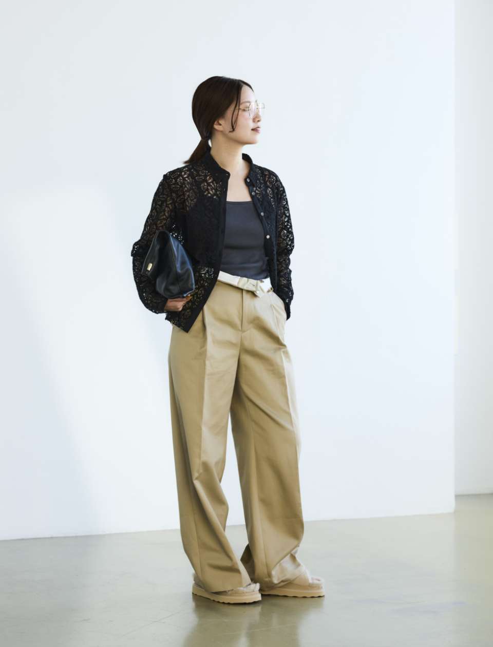 ダークトーンでまとめつつ、レースの透け感で軽快さも。