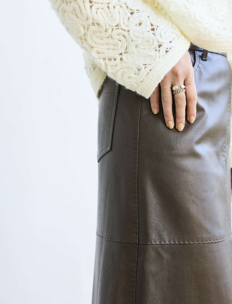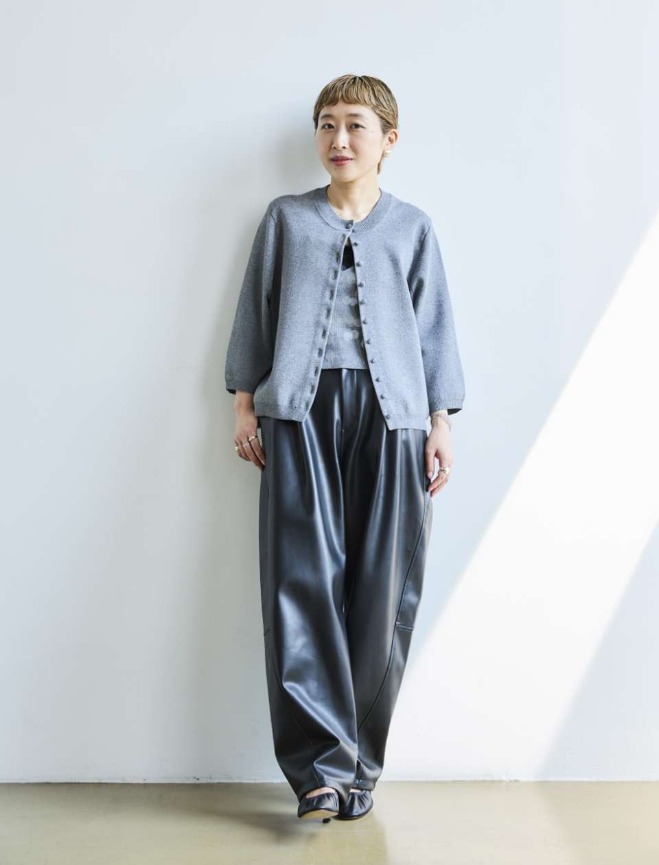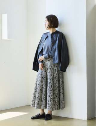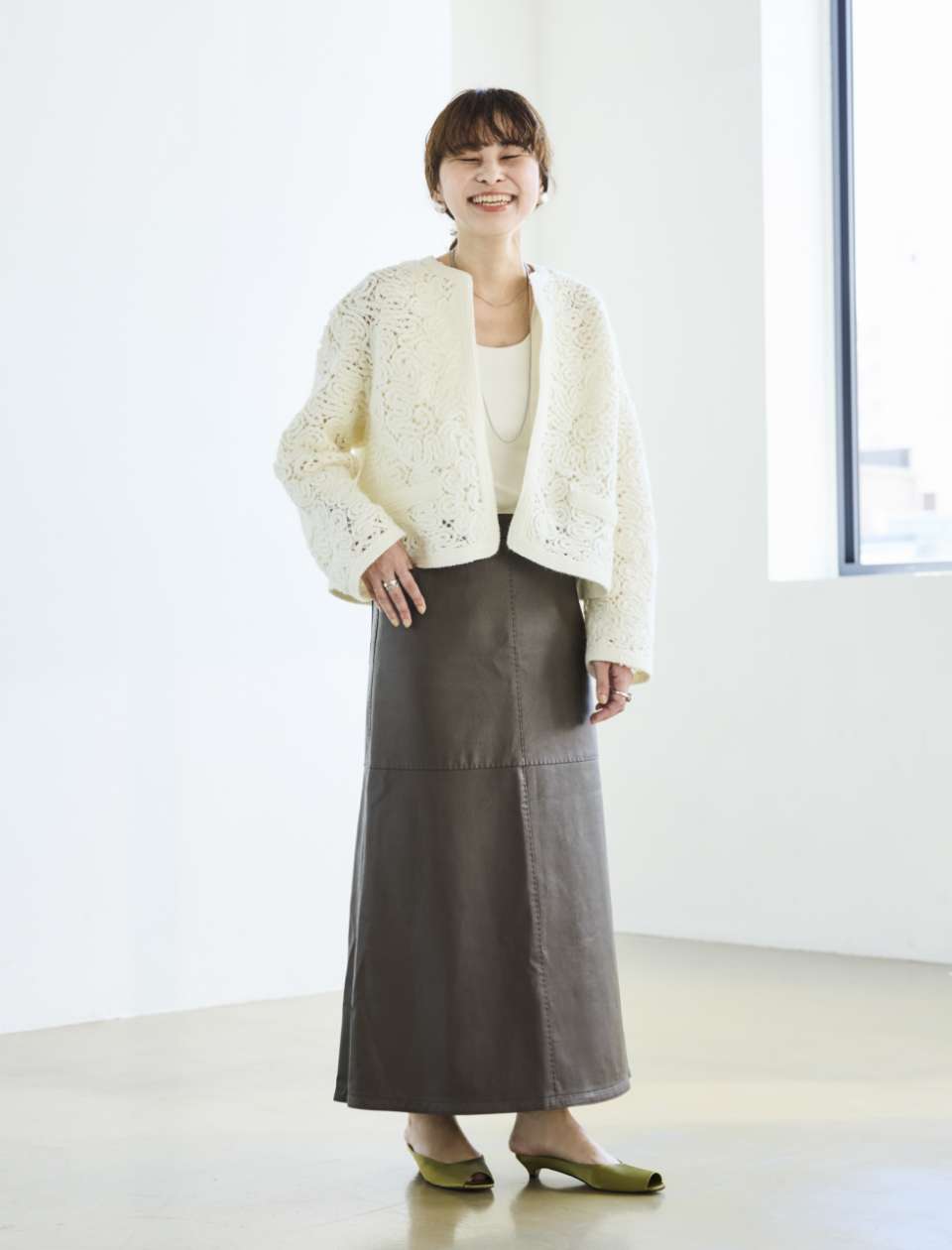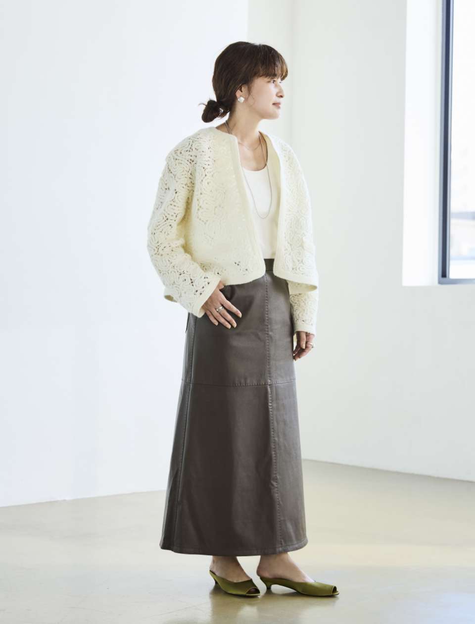 存在感のあるニットジャケットを主役に、レザースカートでシンプルに。