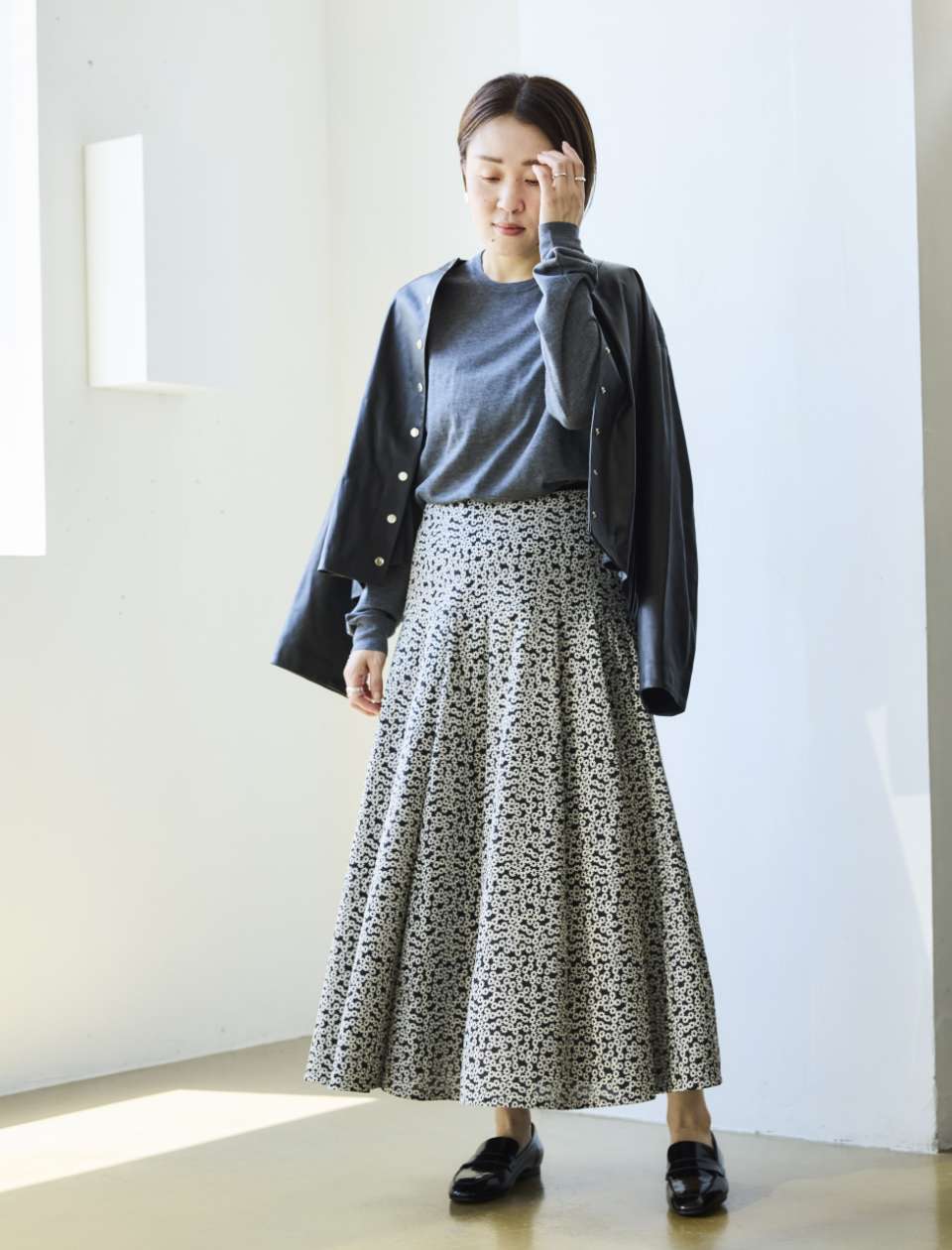 秋の入り口から取り入れたい、フラワー柄のジャガード織フレアスカート。
