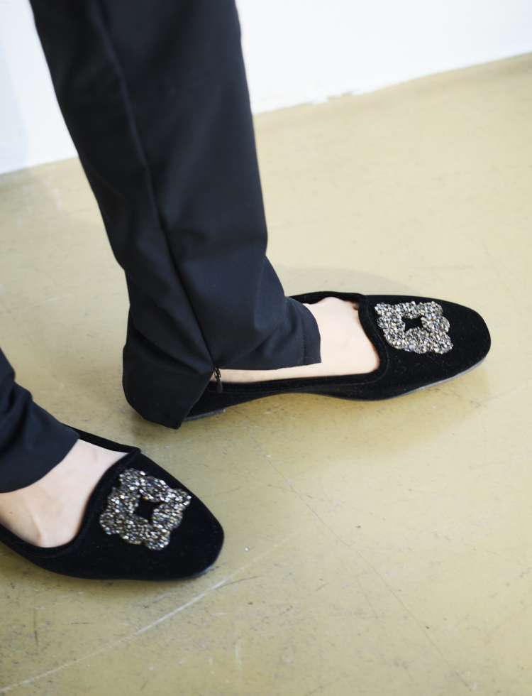 ルームシューズ風の軽い着用感と輝くビジューで気持ちがアップ。