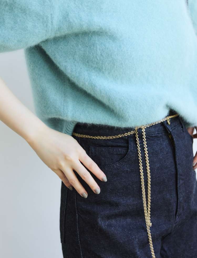 ネックレス使いもできるチェーンアクセをベルトにして。