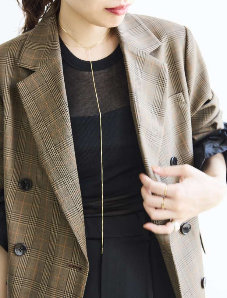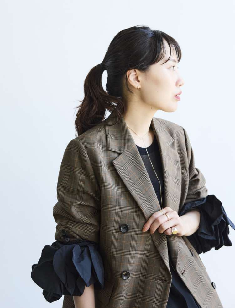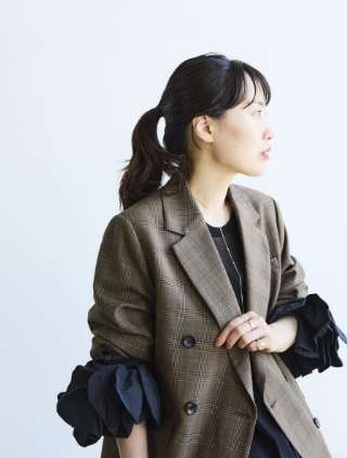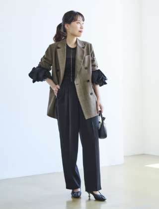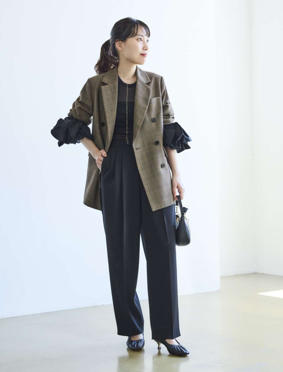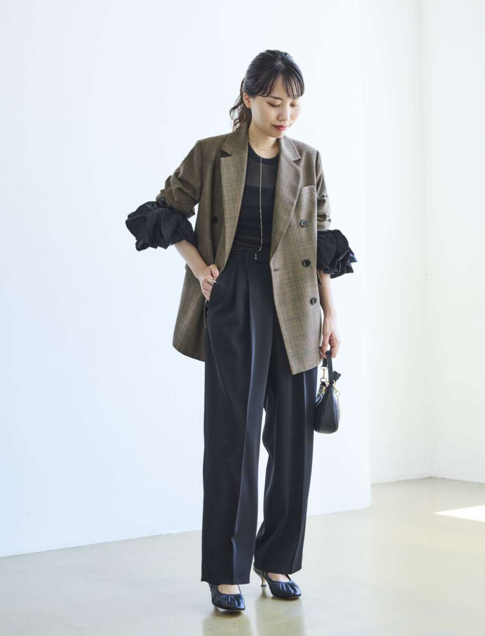 仕立てのキレイなテーラードジャケットは真っ先に手に取る秋アイテム。華やかな付け袖やシアートップスでモードさを加えるのが今の気分です。