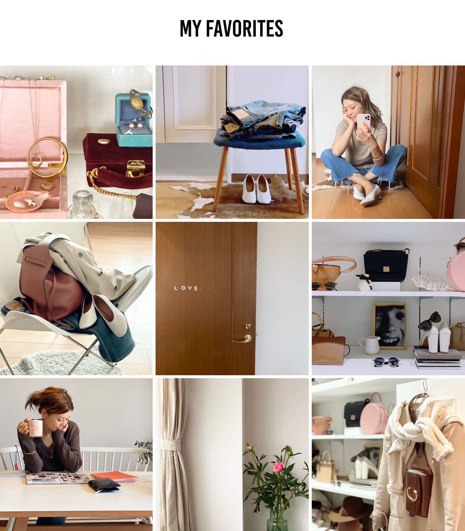 (左上から横に)①愛してやまないLOVE♡な物。②自分の体型や気分に合わせて、何年か前のDENIMも、サイドや裾をセルフカットしたり。永く大切に履きたいDENIM。③上手になりたいな、自撮り。④”MAISON MARGIELA”のモダンシューズで、アップデートしたい。⑤LOVE♡⑥職業柄、大切な空間CLOSET。そのシーズンの気分でレイアウト。色々なアイデアが生まれる場所でもある。⑦気になるものを集めた資料や、書きためたアイデアを、ゆっくり整理しながらまとめる場所。大好きな場所。⑧季節の花を飾る。部屋も気持ちもリフレッシュ♡⑨今季真っ先に買った”EVERYDAY I LIKE.”のジャケット。クローゼットをアップデートする必需品。