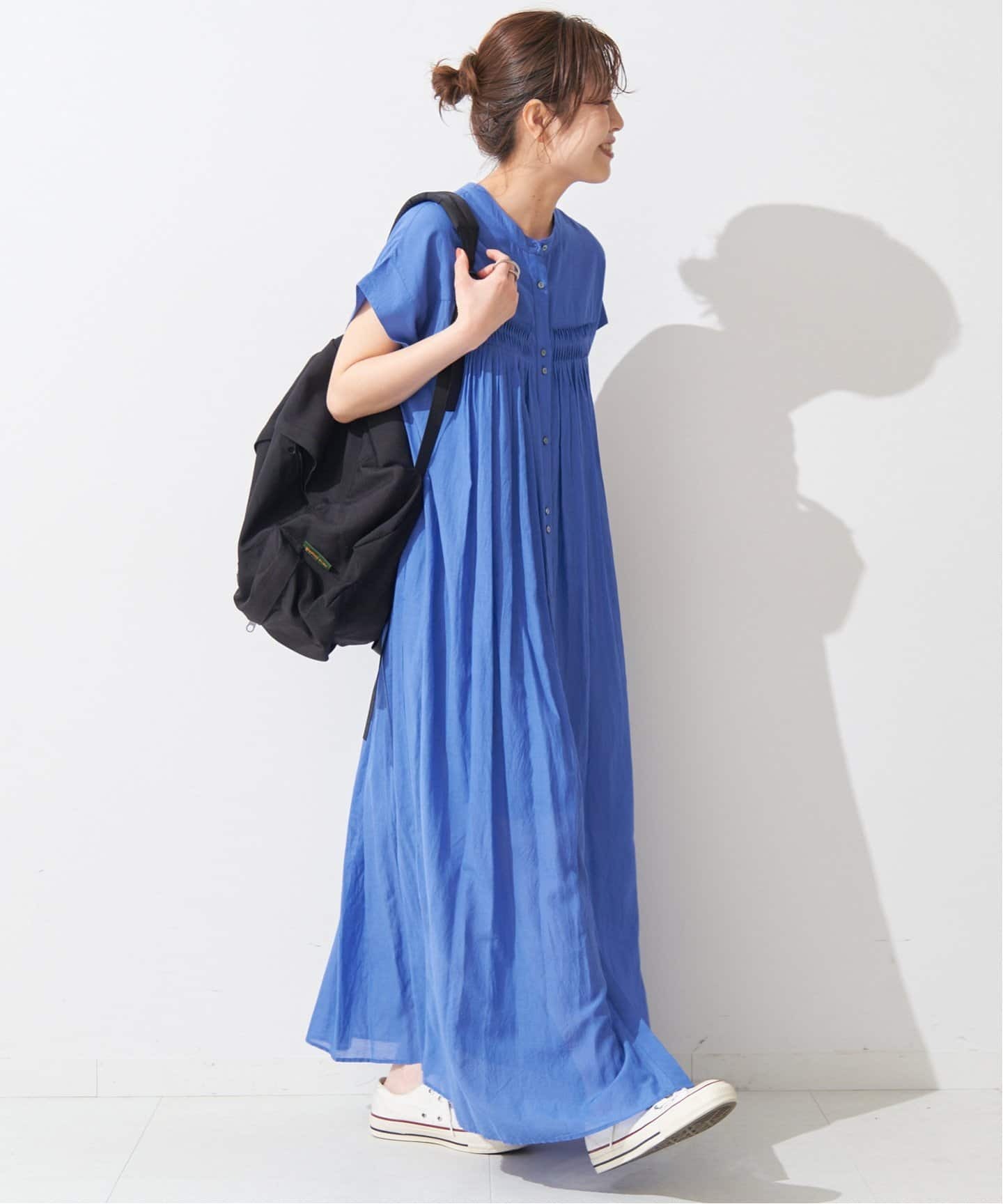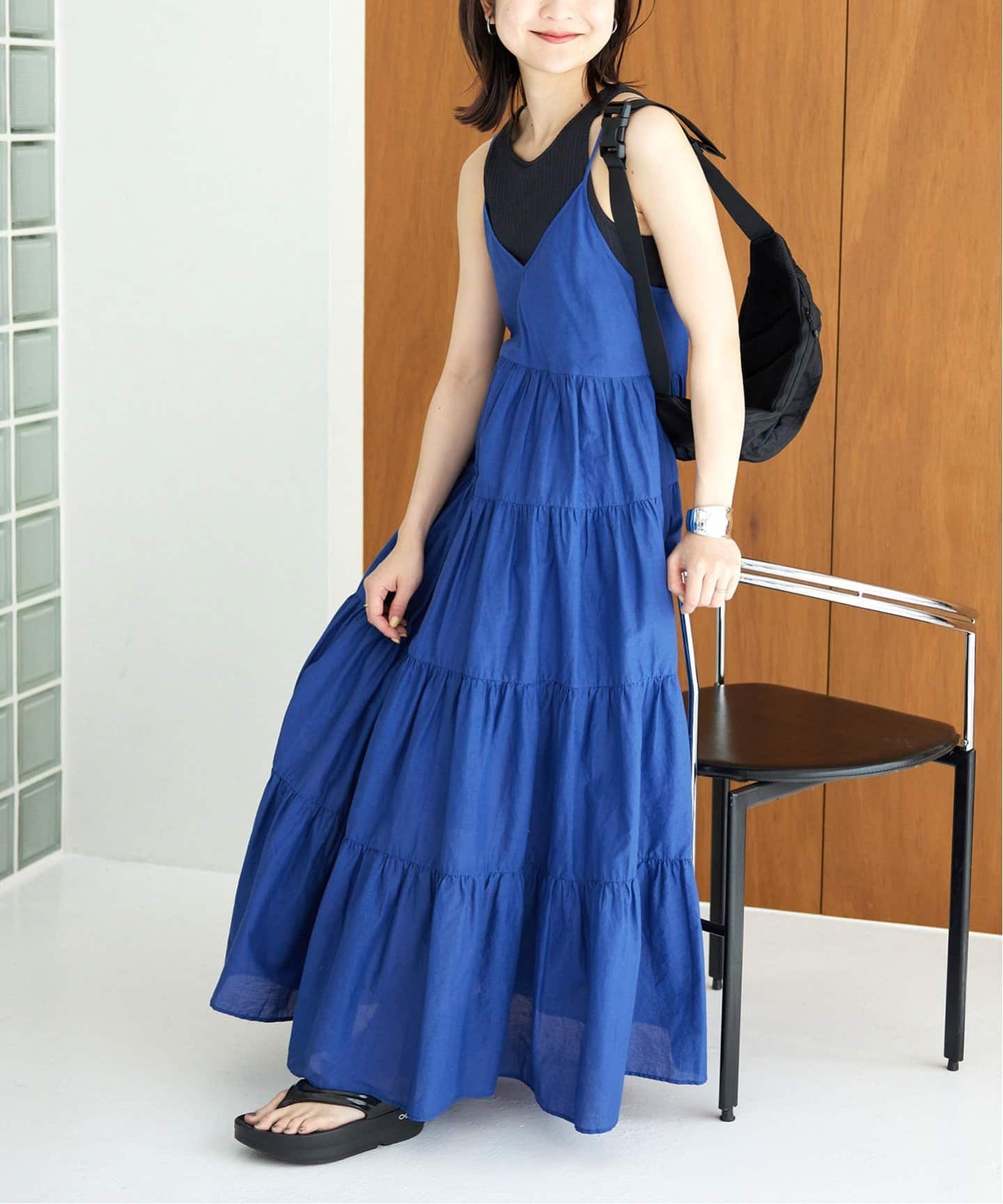 夏空に映えるブルーは濃淡の違いで雰囲気がガラリと変化。ふんわりと風をはらむSLOBE IENAティアードキャミワンピースは、ロイヤルブルーならブラックのようなメリハリがついてトライしやすい。キレイめならLa Totaliteシアースキッパーワンピースをプッシュ。