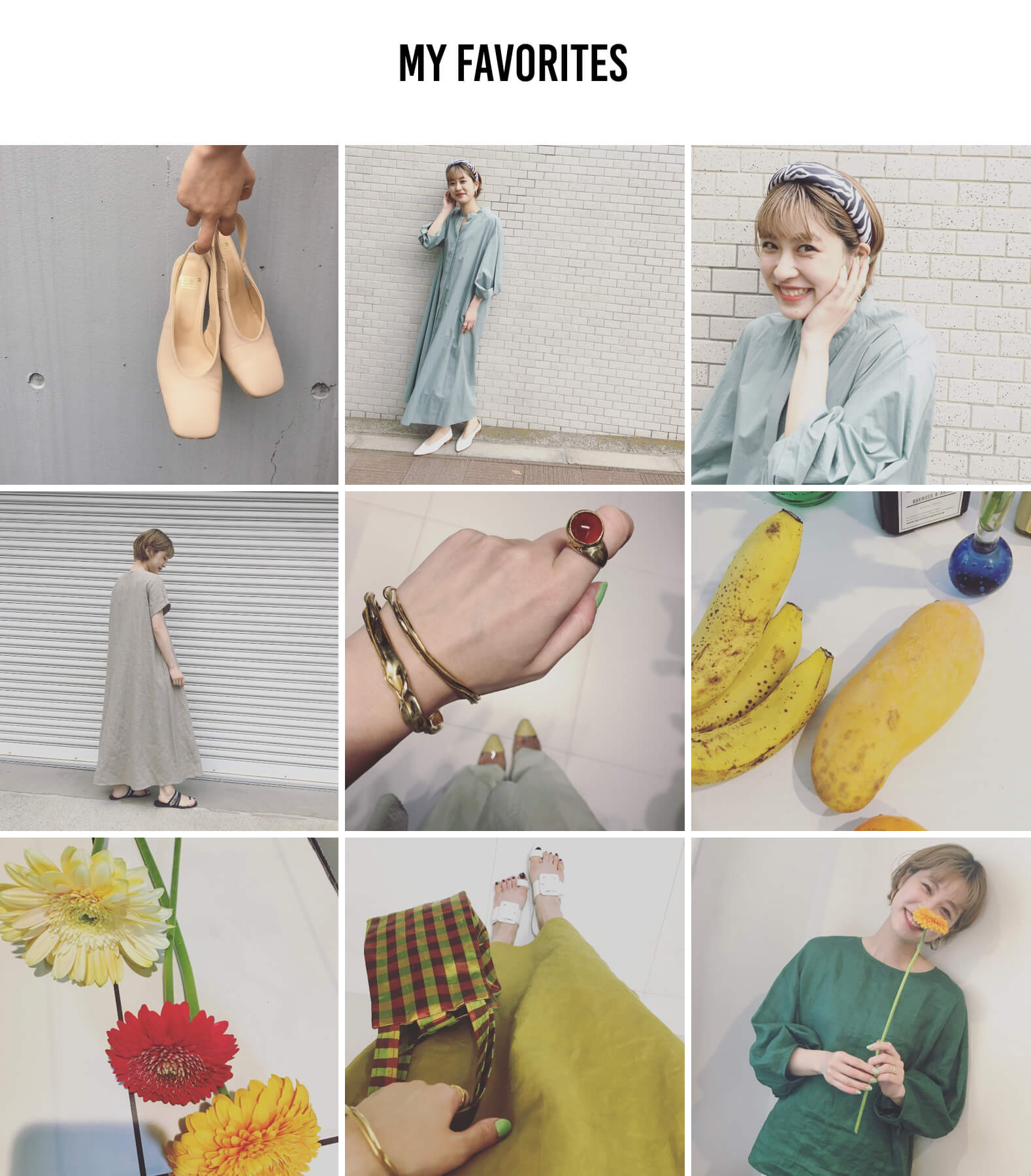 (左上から横に)①まるで裸足のようなヌーディーベージュのパンプス。どんなスタイルにも合わせやすくて重宝します。②ずるっと長めの丈感と淡い色味が素敵。さらっと1枚で着たい。③ゼブラ柄のぷっくりとしたカチューシャ。ショートヘアでもつけられるのでおすすめです。④毎年人気のフレアマキシワンピース。とにかくシルエットが綺麗なので1枚は持っておきたい。春から夏にかけて大活躍すること間違いないアイテムです。⑤”FARIS”のバングルとリングを重ねつけ。この他にもイヤーカフもあってどれも可愛いくて迷ってしまう。⑥果物だいすき。あっという間になくなってしまう。自宅には必ずなにかしらの果物がストックしてあります。⑦こんな時でもお花を飾っておうち時間を楽しみたい。⑧ギンガムチェックのバッグに合わせてコーディネートを考えてるところ。⑨おうちでもおしゃれしていたい。そんな時はとっても着心地が良いこのブラウスを着ると気分が上がります。