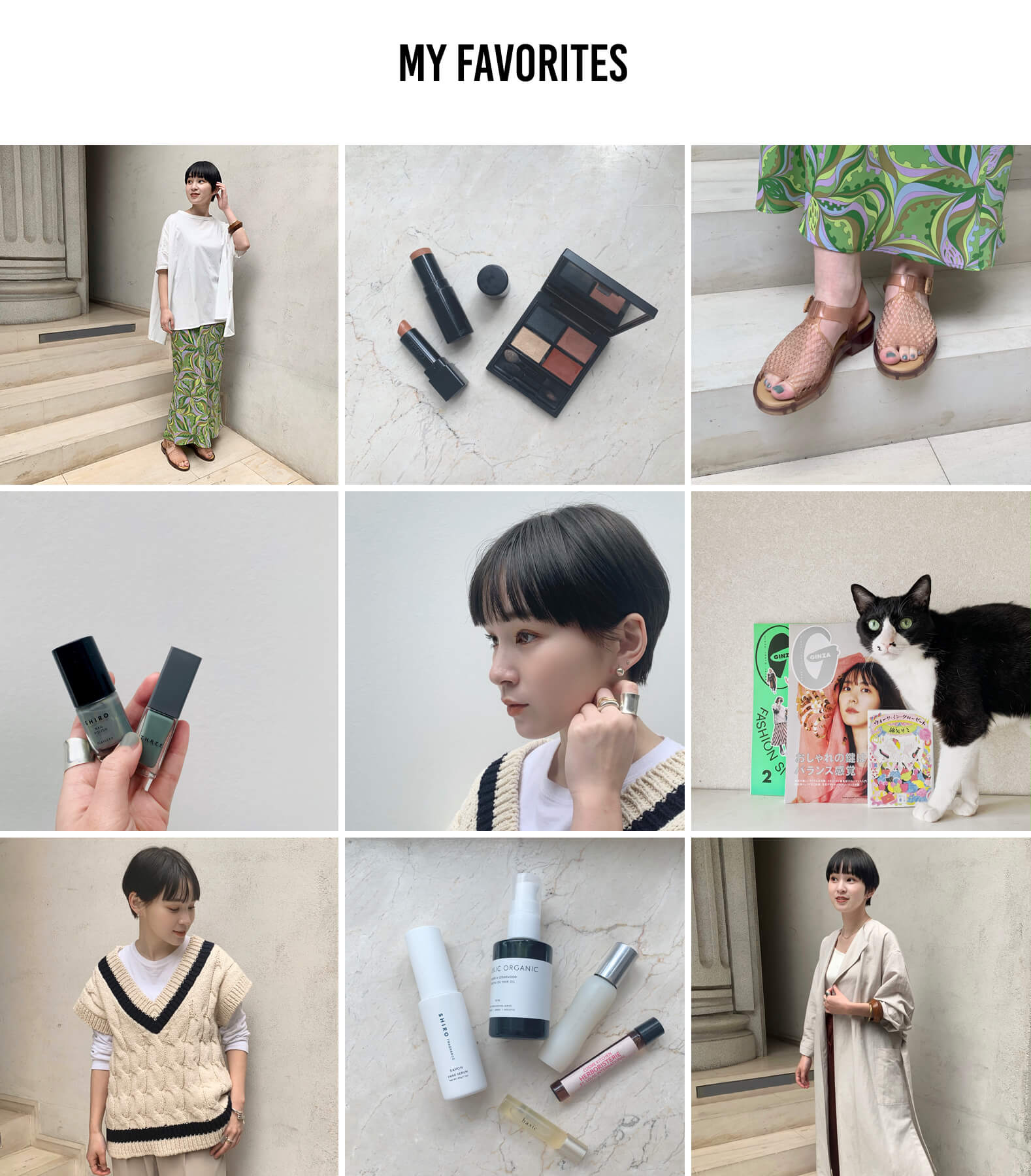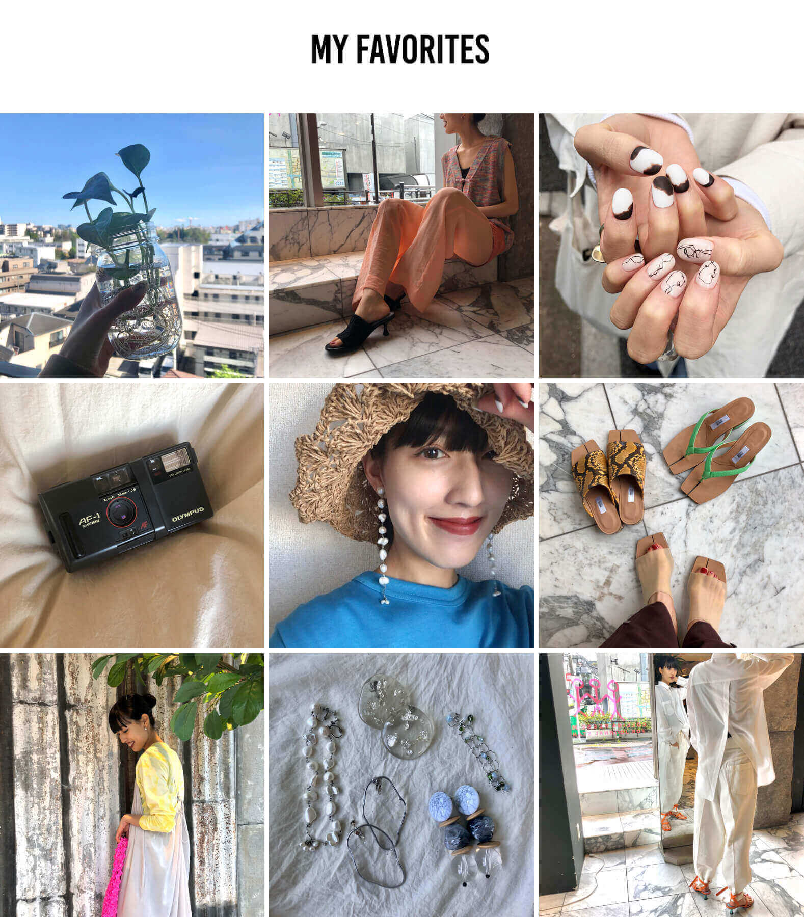 (左上から横に)①観葉植物はおうち時間で緑を感じたくて、友達から貰いました。オシャレな瓶に入れて毎日水を変えて光合成をさせています!観葉植物って癒されますね。②春夏のオススメスタイリング、カラー使いがかわいいコーディネート!”YANYAN”は着ているだけでオシャレに、トレンドスタイルになるので大好きなブランドです!”YANYAN”に合わせたのは”TELA”のワイドパンツ。透け感のある素材でこれからの季節にぴったり!是非挑戦したいスタイリングです。③毎月ネイルをしていて、このデザインはかなりのお気に入り。毎日手元を見るだけでテンション上がります!④出かけるときにはフィルムカメラを必ず持ち歩いて、友達や先輩をたくさん撮っています。今はおうちの中での「日常」をテーマにシャッターを切っています。⑤去年の夏に購入した帽子。夏らしいカラーのワンピースに、お気に入りのピアス、赤リップでばっちりキメて、お出かけしたいなと妄想中!!⑥この夏マストの”miista”サンダル。ジャーナルスタンダードには3型入荷しました。足袋型のソールのデザインが可愛すぎて一目惚れ!どれも可愛くて選べません...。⑦上品なマットサテン生地を使用したキャミワンピース。スカート部分は歩く度に揺れる上品なフレアで、着痩せ&体型カバーを叶える嬉しいシルエット。インナーには"COLLINA STRADA"のタイダイのカットソーを入れてトレンドスタイルに!⑧お気に入りのイヤリングたち。存在感のある大振りなイヤリングが大好きです。毎回洋服に合わせてイヤリングを選んでいます。⑨リヨセルコットンバックスリットシャツ。背中がバックり空いたデザインのきいた透け感のあるシャツで羽織っても一枚できても可愛いです。白でまとめて足元に指し色を入れて遊んでみました。これからの季節、白×白のスタイリングは鉄板です!