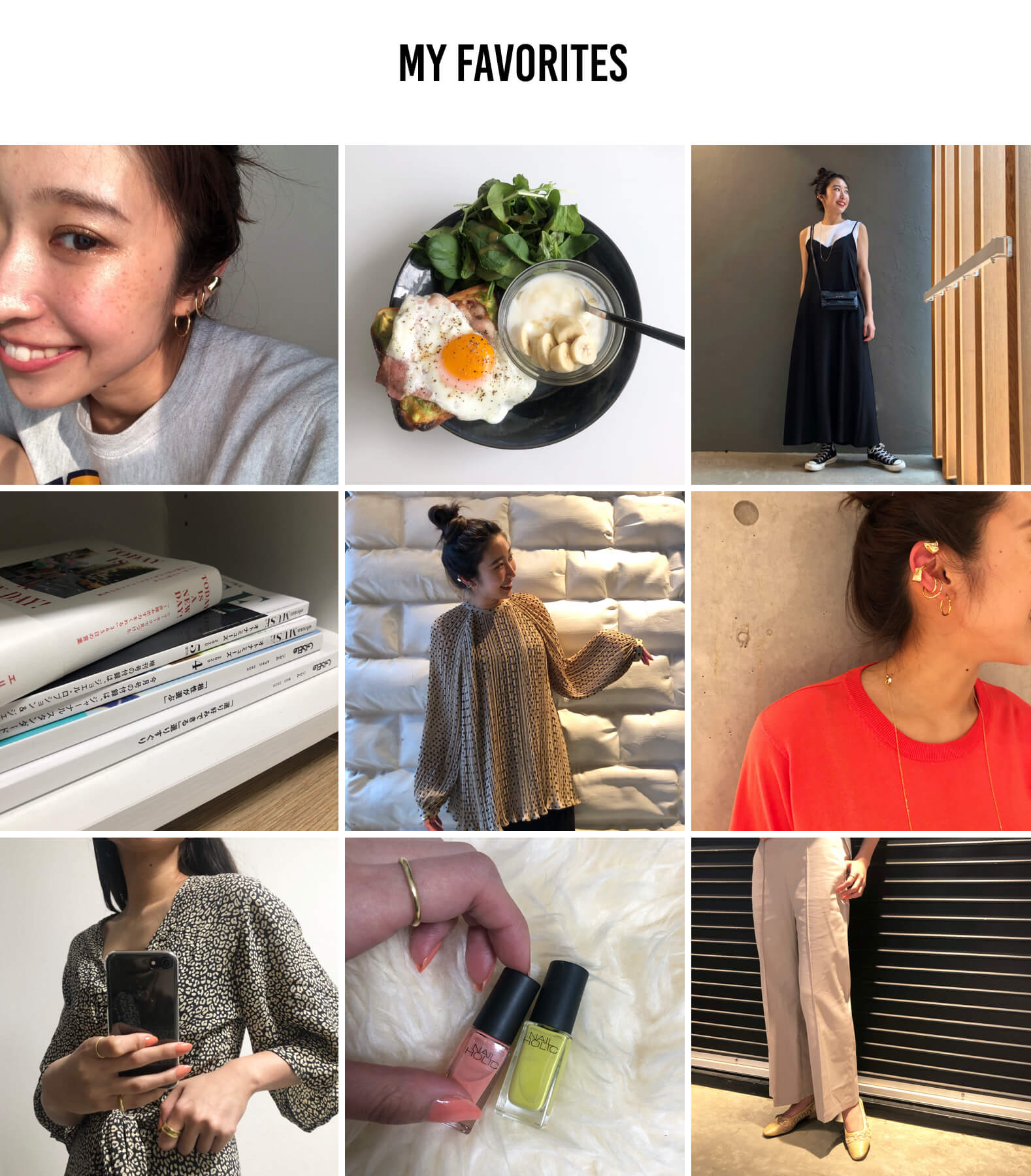 (左上から横に)①マスク生活が始まってからアイメイクを楽しんでます!写真だと分かりにくいですが、キラキラなラメ感があるシャドウがマイブームです。②朝昼兼用で、簡単なカフェっぽいプレートを食べるのが毎日の楽しみになってます。③キャミソールワンピースは好きで何枚も持ってますが、今年らしいサテン地が可愛い1枚です。シンプルにキャミワンピースを主役にモノトーンで合わせたい!④大好きなコーヒーを片手に、以前購入してた本や雑誌をじっくり読む時間が増えました。⑤動く度に揺れ感の出る”CLANE”のドットブラウス。本当に可愛いです!シルエットデザイン共に、着るだけでときめきます。⑥アクセサリーはゴールドな気分。ボリューム感たっぷりの”FARIS”のイヤーカフがお気に入りで、洋服はシンプルな物を選ぶことが多いので重ね付けするのが好きです。⑦去年購入したのお気に入りのワンピース。ポシェットにサンダル履いて赤リップ塗って、お出掛けがしたい!など妄想中...。おうちでは特に、柄物や色物など着て気分を上げて過ごしてます。⑧これを機にセルフジェルネイルに初めて挑戦。薬局で手軽に購入出来る”NAILHOLIC”が、カラーバリエーション豊富でコスパの神様です!⑨これぞ美脚パンツ!センタープレスが施されており形がとにかく綺麗です。デザインが入ったシースルーなパンプスを合わせてぬけ感を出してみした。