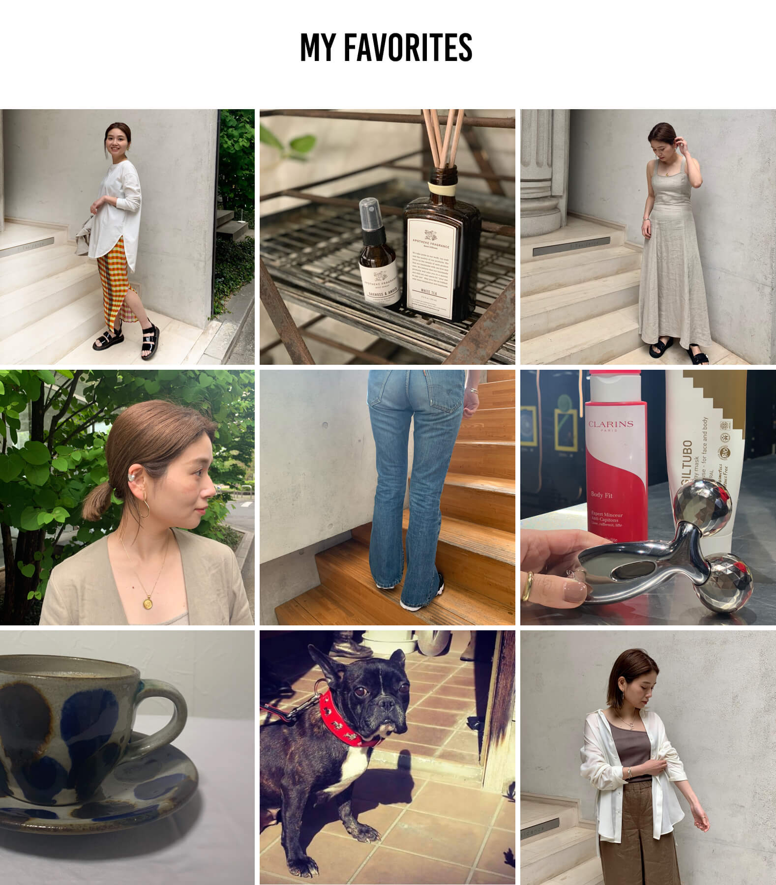 (左上から横に)①大人気のラウンドヘムTEEは、一枚でお洒落に決まるアイテム!②大好きなアポテイケは4年くらいずっと使っていてすっきりした匂いで癒されています。特に洋服に付けるファブリックスプレーは、持ち運びできる大きさで便利!メンズで購入できるので、色々試してします。③L'ESSAGEのアイテムも大好きで、”MARYAM NASSIR ZADEH×LESSAGE”別注のワンピースはお気に入り。ジャケット合わせやTシャツ合わせで夏は着たいです!④アクセサリーは”FARIS”をよく付けます。今期4つ購入し、髪の毛を15cm切ったので色々楽しんでいます。一番のお気に入りはイヤーカフ。⑤何十本も持っているくらいヴィンテージのデニムが大好き!特にLEVIS646は美脚効果があり、スタイリングする上欠かせないアイテムです。大阪や東京の古着屋にも行きます。⑥お家では、暇さえあればボディケアをしています。サボりぎみですが(笑)後輩スタッフに色々聞いて実践しています。ドロパックは透明感が増す気がするので愛用中です。⑦毎日かかせないコーヒーは、友人のコーヒーSHOPで。体の半分以上コーヒーで出来ているんじゃないかと言われるくらい無類のコーヒー好き!ジャーナルスタンダードで購入した、やちむんに注いで飲むとリラックス出来ます。⑧幼い時からフレンチブルドックを飼っていて、今でもよく遊んでいます。⑨リラックス感抜群のスカート風のリネンパンツはこれからの季節におすすめです。