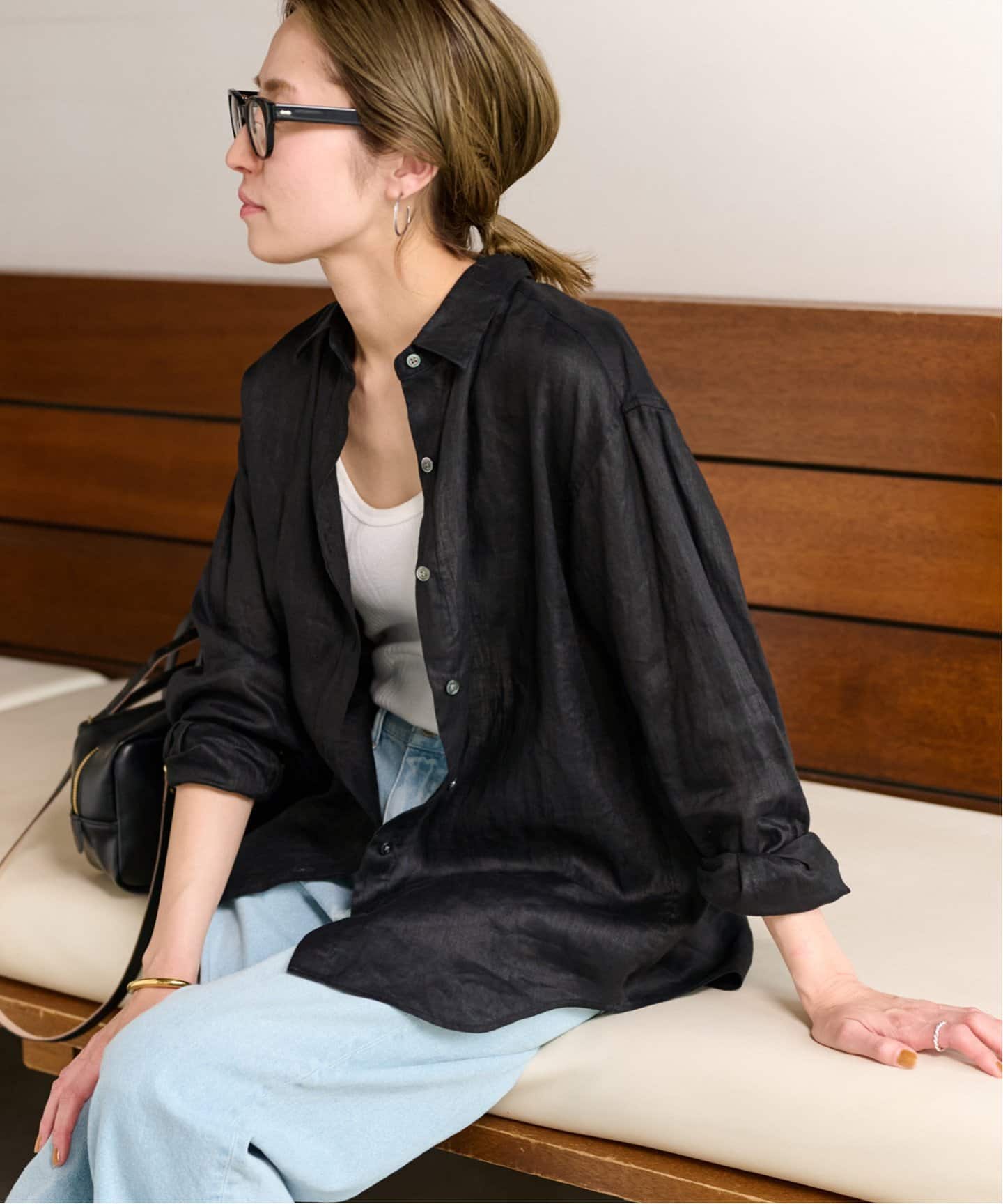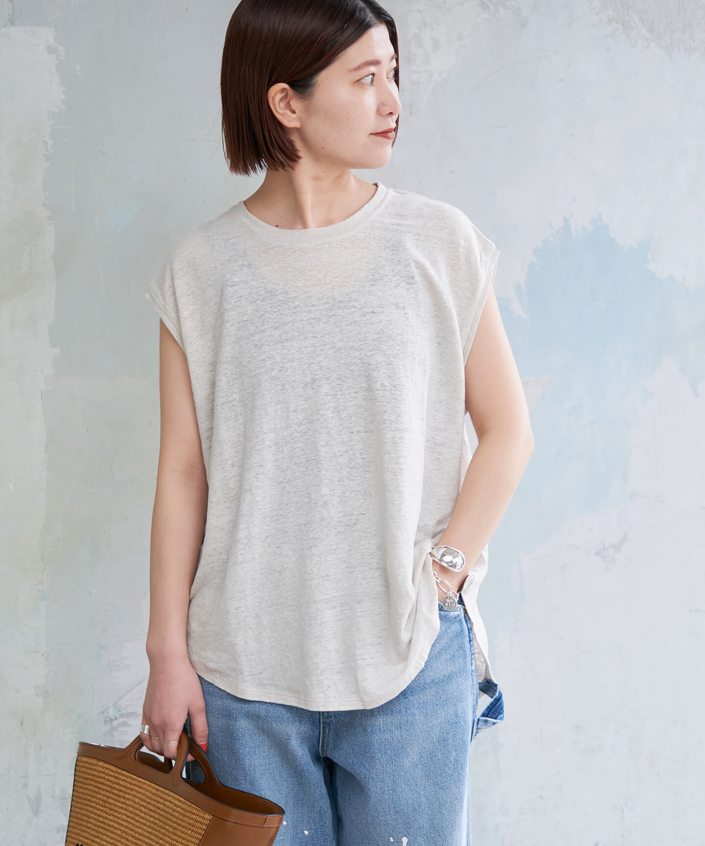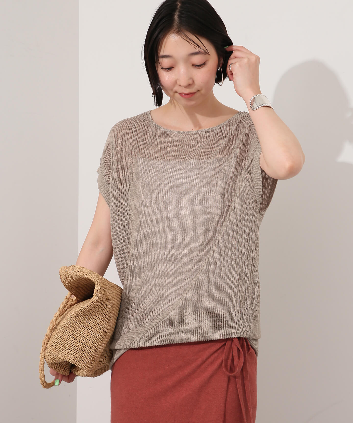 リネンアイテムに支持フレンチリネンコットンスカートは、リネンにコットンとポリウレタンを混紡することによってシワになりにくく、洗練されたハリのある表情に。見た目にも涼しげなリネン混フレンチスリーブニットは、ゆるっとした落ち感がこなれていて肩周りをカバー。