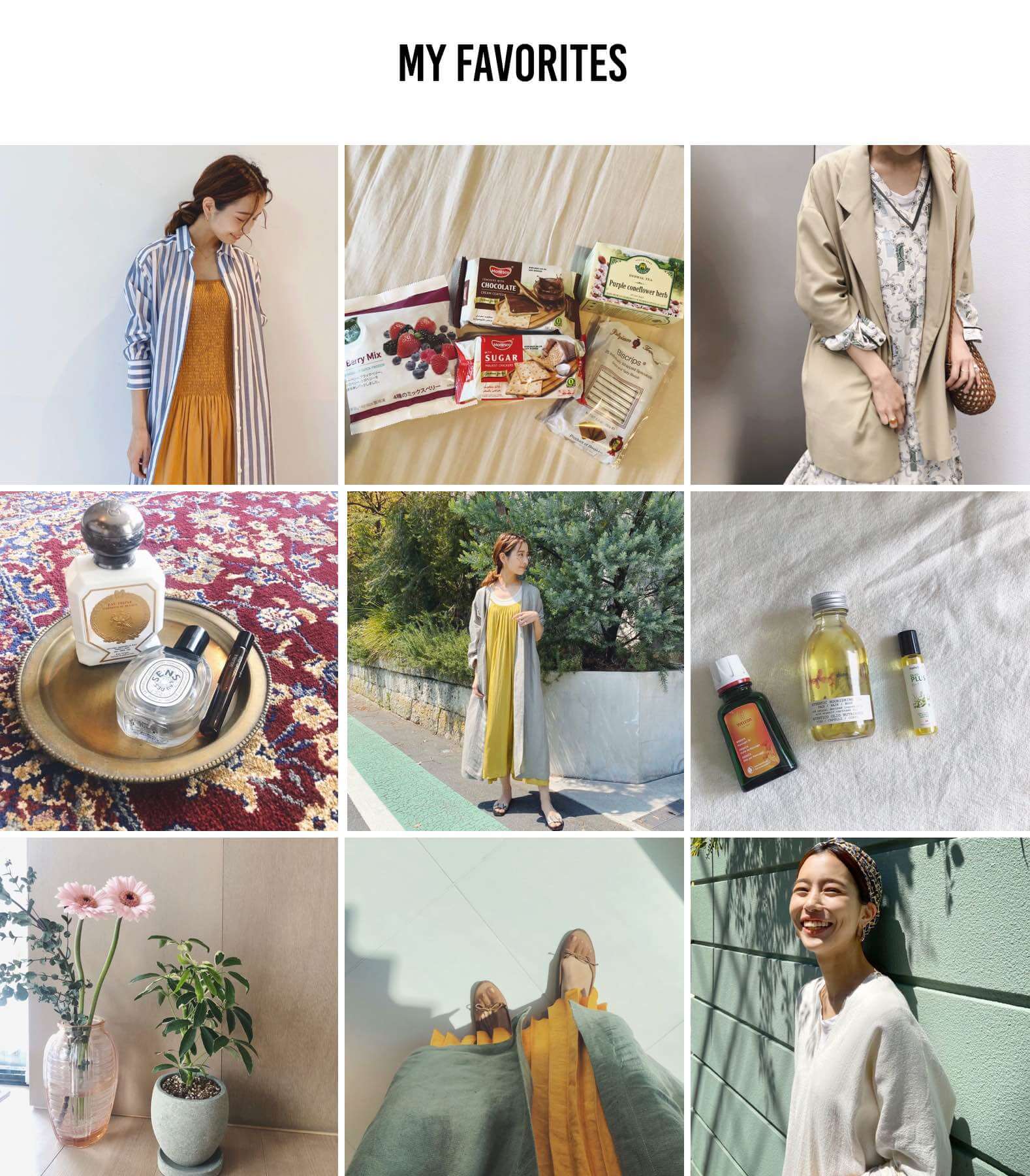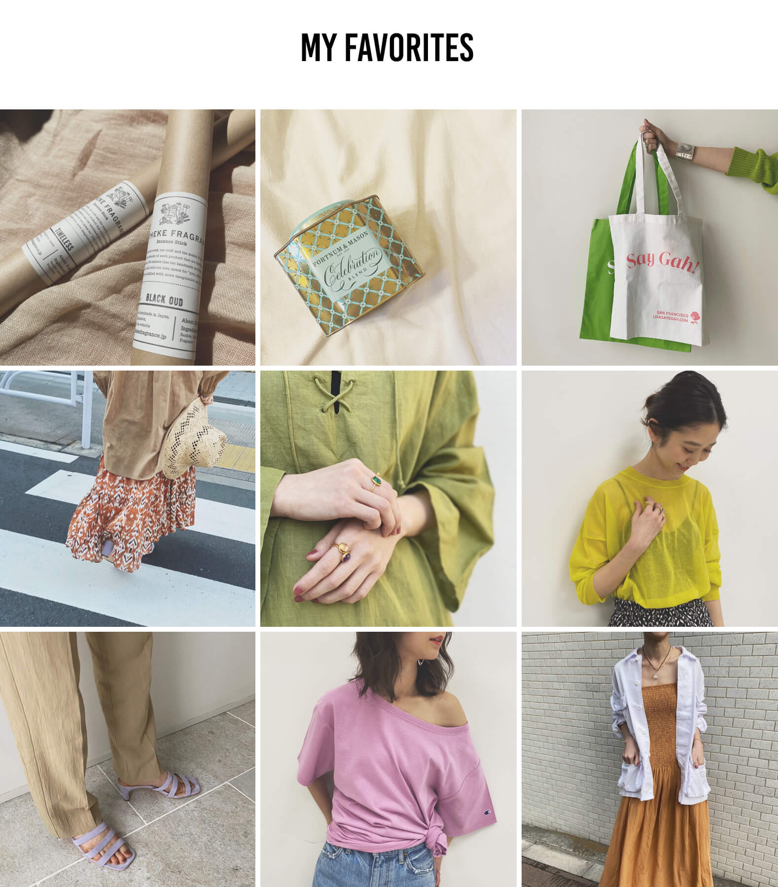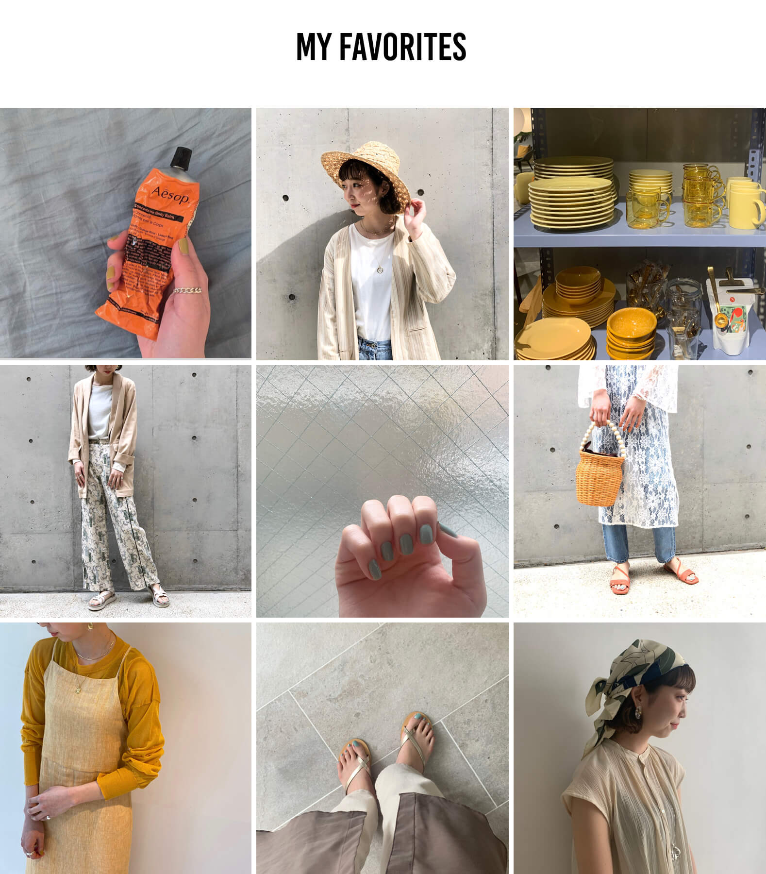 (左上から横に)①撮影でのコーデ。中のベアトップタイプのワンピースのカラーが絶妙で可愛い!着心地もよくて狙ってるアイテムです!②お家時間が長いので食べ物にも楽しみが欲しくて、食べたことない海外のお菓子をパケ買いしたりしてます。予想外に当たりが多くて、真ん中のパイのようなお菓子が今のお気に入り!③路面店とweb限定取り扱いのFi.mというラインのもの。シンプルながら、どこか一癖あるアイテムが多くて大好きです!④香りも生活のなかで大切なアイテム!少し癖があったり、やや重めな香りがタイプです。⑤撮影でカラーが好きだったコーディネートです。足元のパイソン柄のサンダルも可愛くて、密かに狙ってます!⑥年中乾燥肌なのでオイルは必須!肌も強くないので、オーガニックブランドが好きで、香りが好みなものをちょくちょく買っては試してます。⑦お家には大体お花をいけてます!植物があるだけで気分が明るくなります。観葉植物はすぐ枯らしちゃうので、頑張って育ててます!⑧透け感のあるチュールのバレエシューズ。ほぼフラットシューズなので、新鮮でこれからの季節履けるタイプのバレエシューズは嬉しい!⑨今期お店で買ったVERSOのワンピースと、PAROMAのヘッドアクセ。どちらもお気に入りでプライベートでもよく身につけてます。