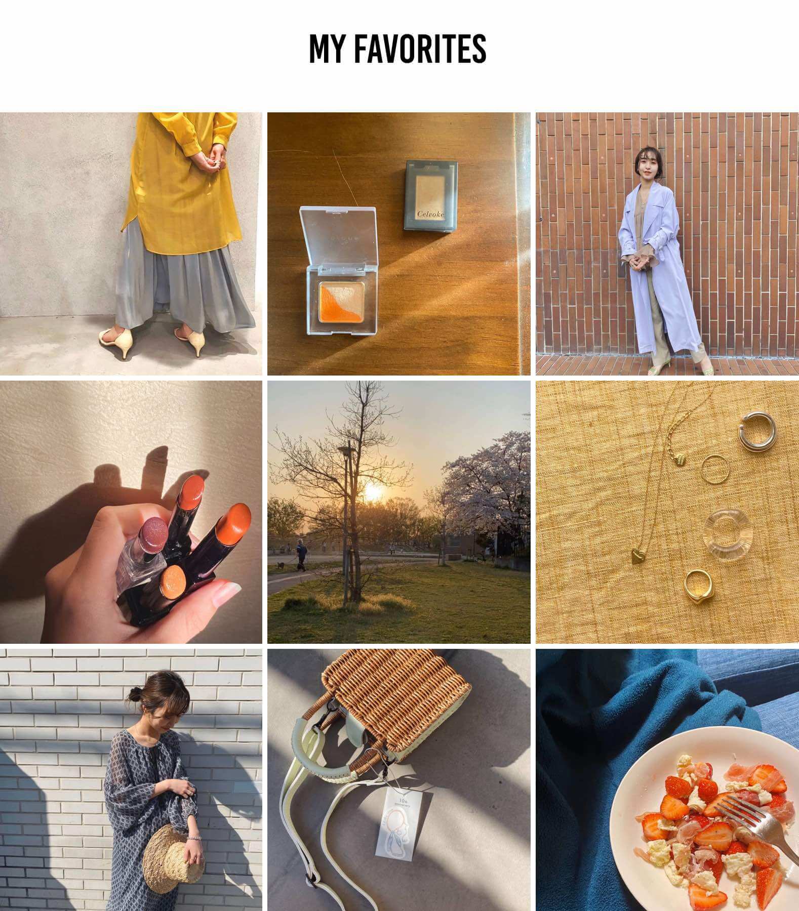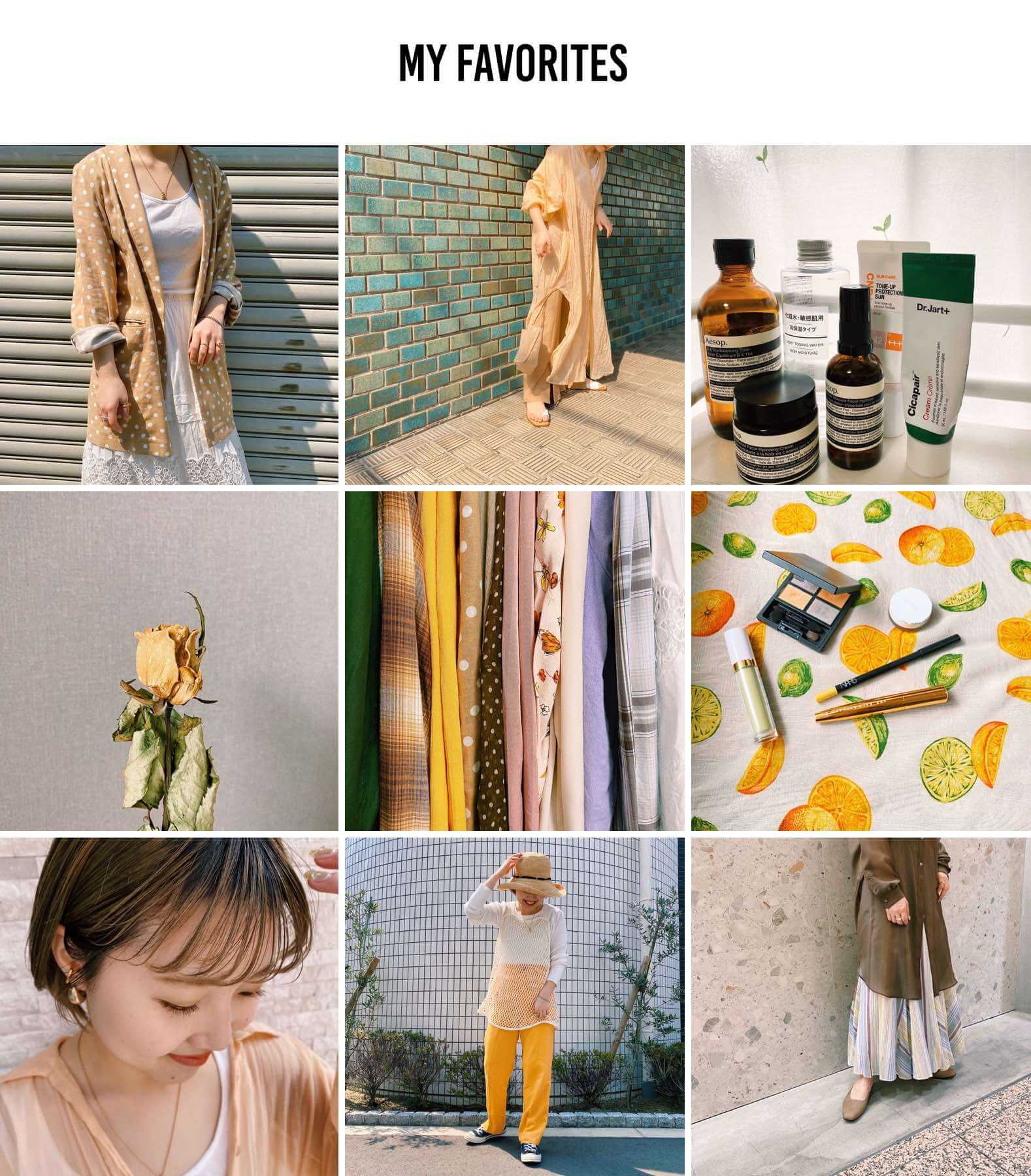 (左上から横に)①②暖色系のお洋服が大好きで、今年はシアーな透け感のあるお洋服が気になります。⑦おうち時間では、カラーメイクとスキンケアを研究中。③スキンケアのお気に入りはAesop。私の肌にとてもあっていて、香りがとても好きで癒されます♡⑥普段のメイクでは、to/one、celvokeを使ったオレンジメイクを楽しんでいます。⑧⑨お洋服が本当に大好きなので、外に少しでも出る機会があれば、お気に入りの服を着て気分を上げています。