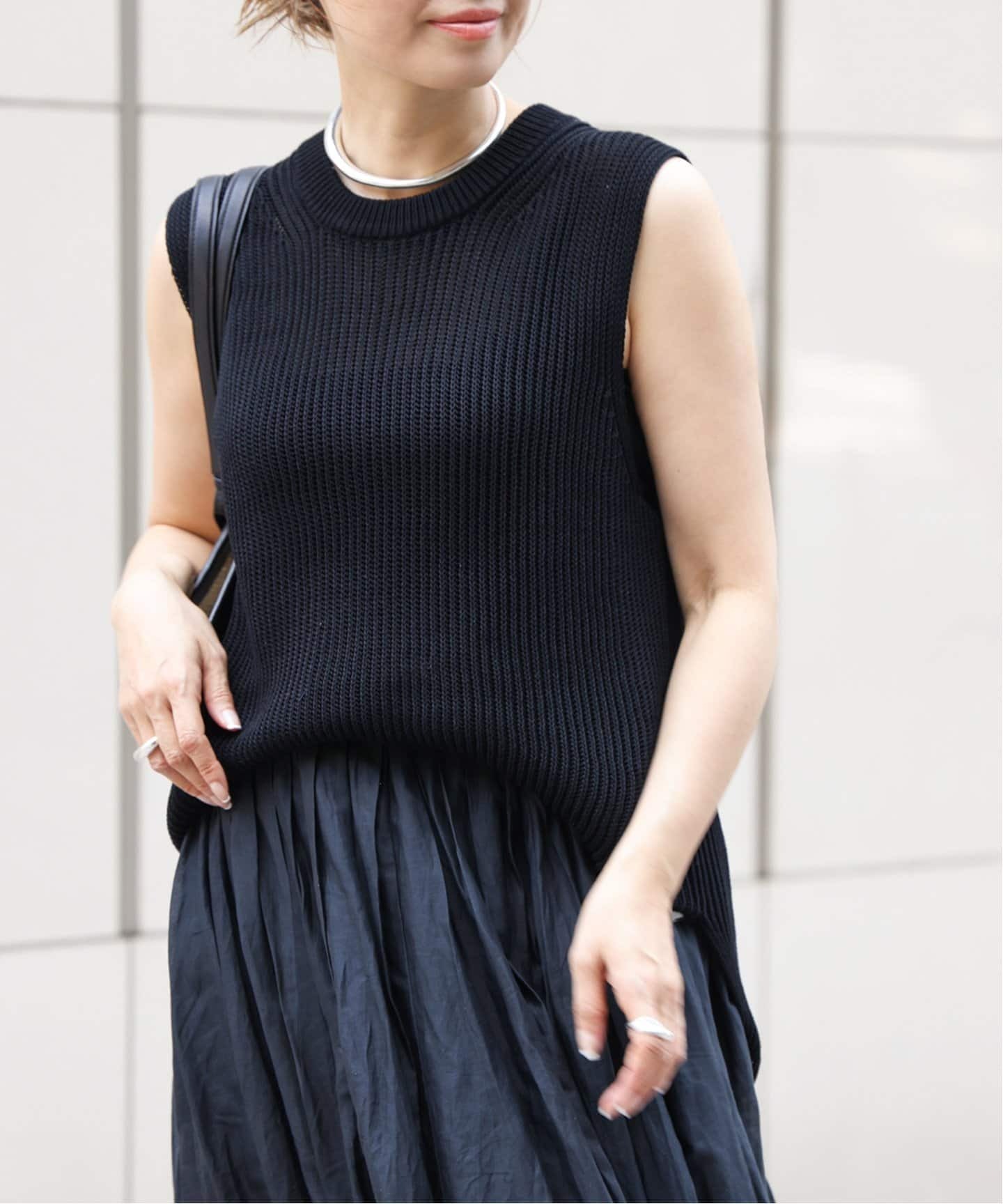 サマーニット真夏でも涼しく着映えるデザインのノースリーブプルオーバーとして注目なのがFRAMeWORKの麻混ノースリーブフレアPO。サイドのスリットがワンポイント。広めに開いた肩幅によって肌離れよく、スッキリ着られる気の利いたデザイン。