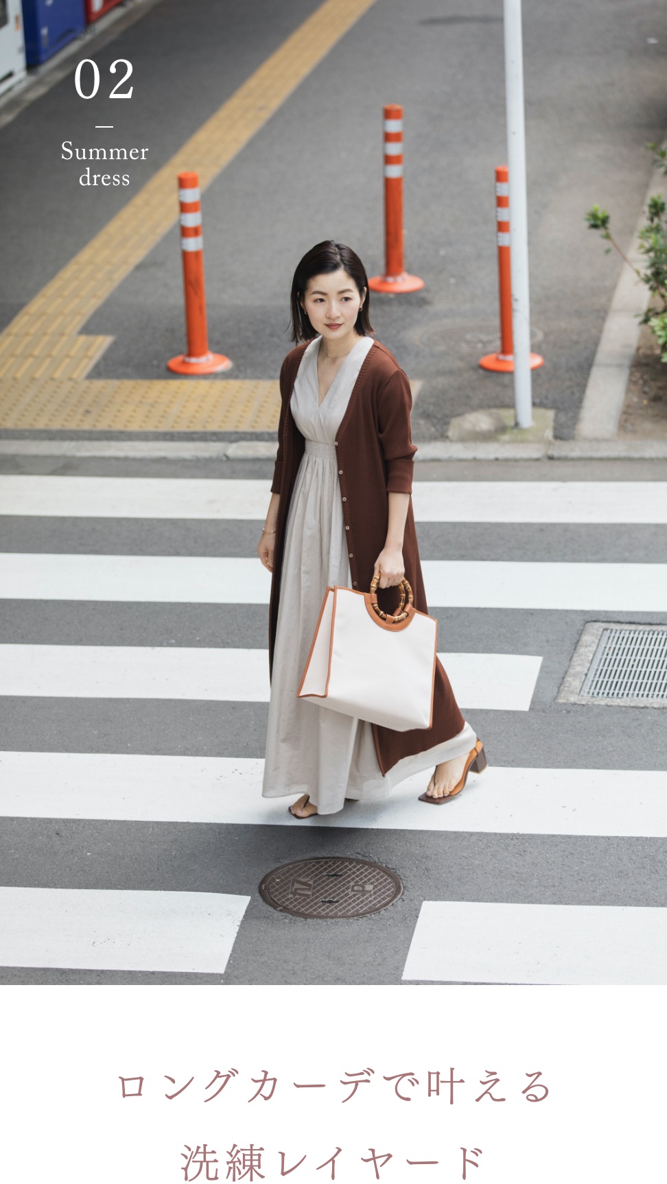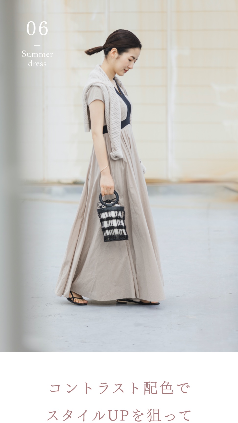 外側に濃い色で縦長ラインを生み出し、より着やせを狙います。スクエアシルエットのバッグは、持ち手がバンブー素材のものをチョイスすれば、シティ感を演出しつつ、軽やかなドレスのムードにもマッチ。