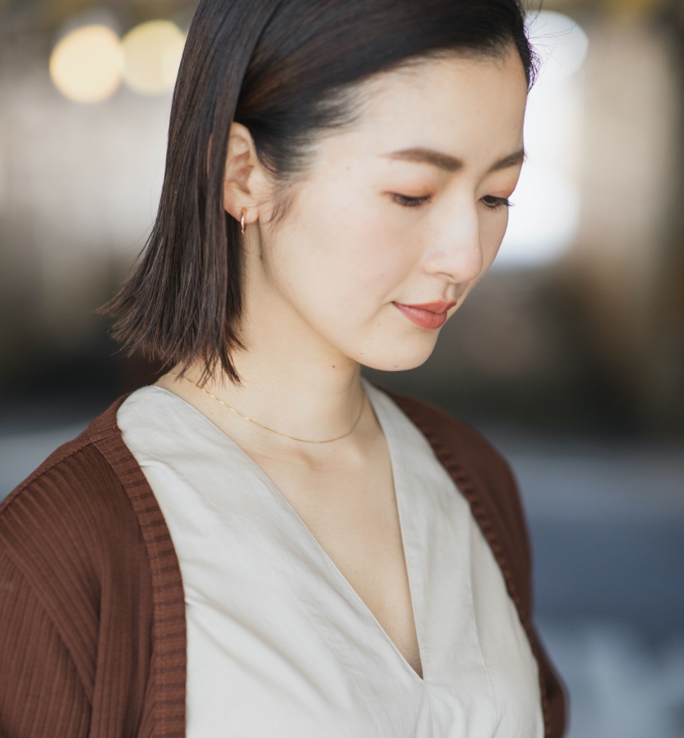 裾にフレアが広がる落ち感あるシルエットは、フェミニンなのに甘すぎず、上品な印象です。