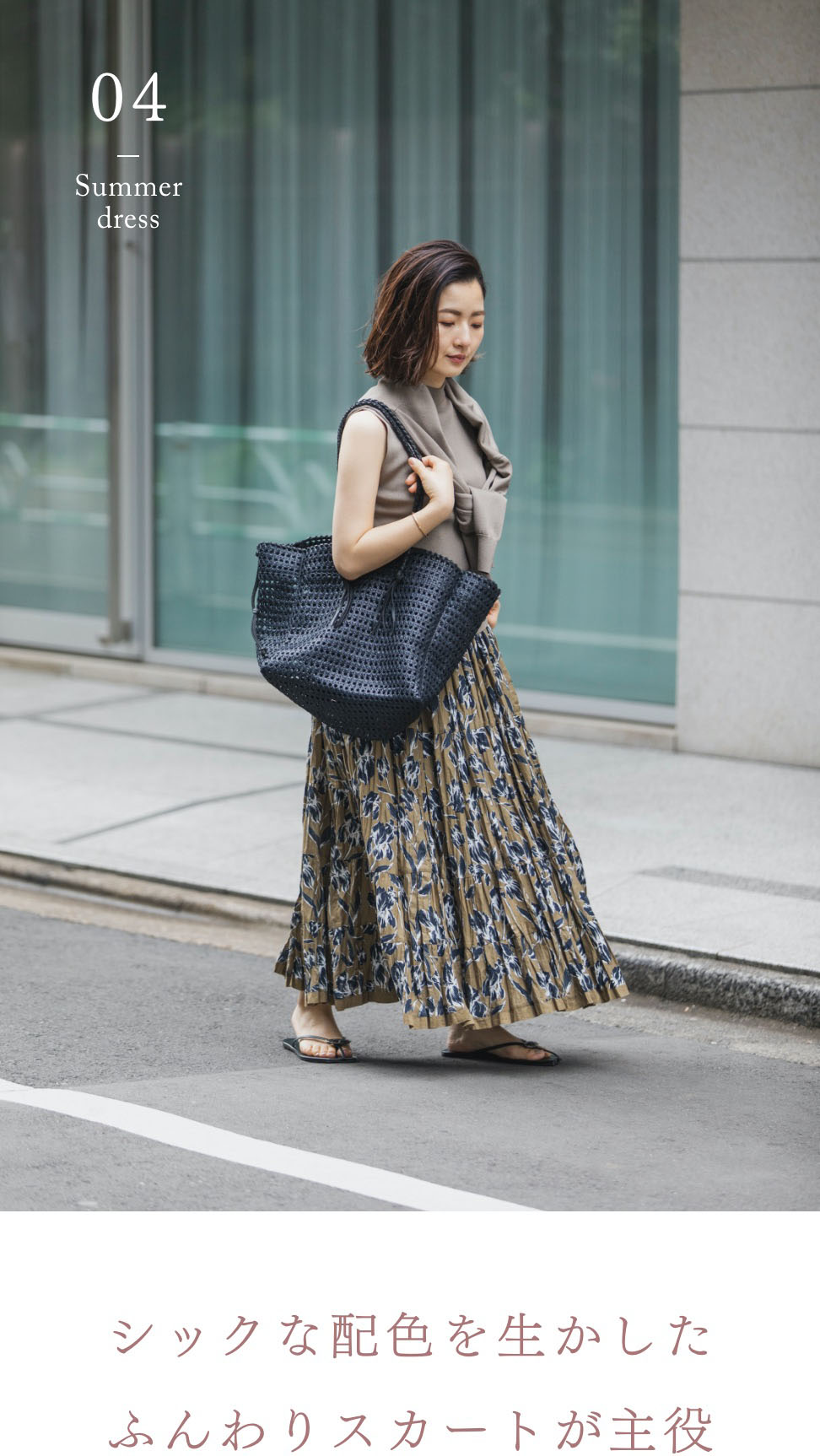 バカンスムード漂う花柄はシックな配色なので、大人っぽく都会的に着こなせます。