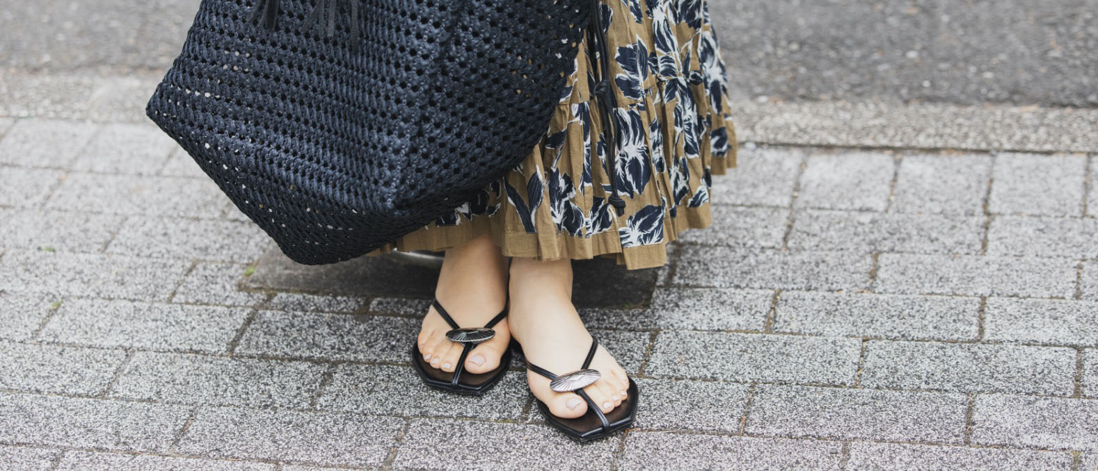 靴やバッグは、柄と喧嘩しないよう黒でシンプルに引き締めて。