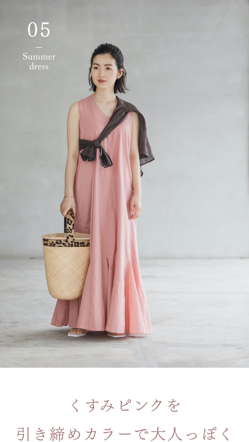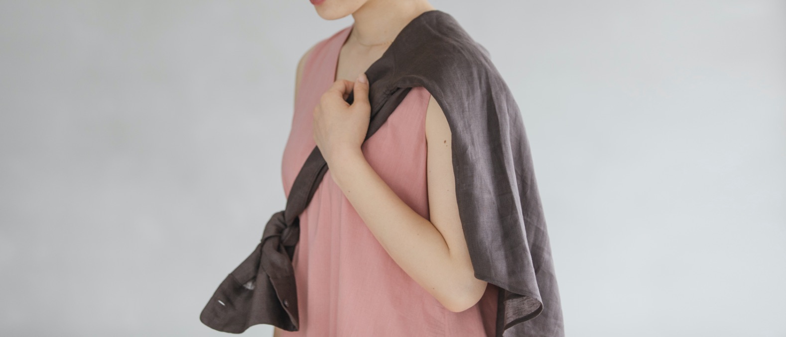 ノースリーブなので、羽織りを一枚持つならリネンシャツをセレクト。