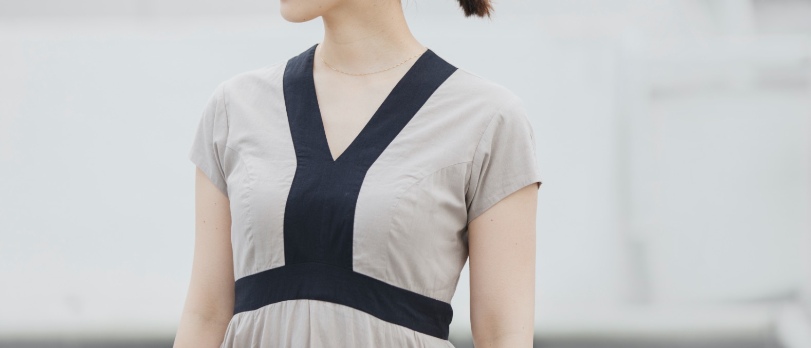 大胆なV字のネックラインが首元をすっきりとシャープに見せ、バスト下のギャザー切り替えで脚長効果もあり。