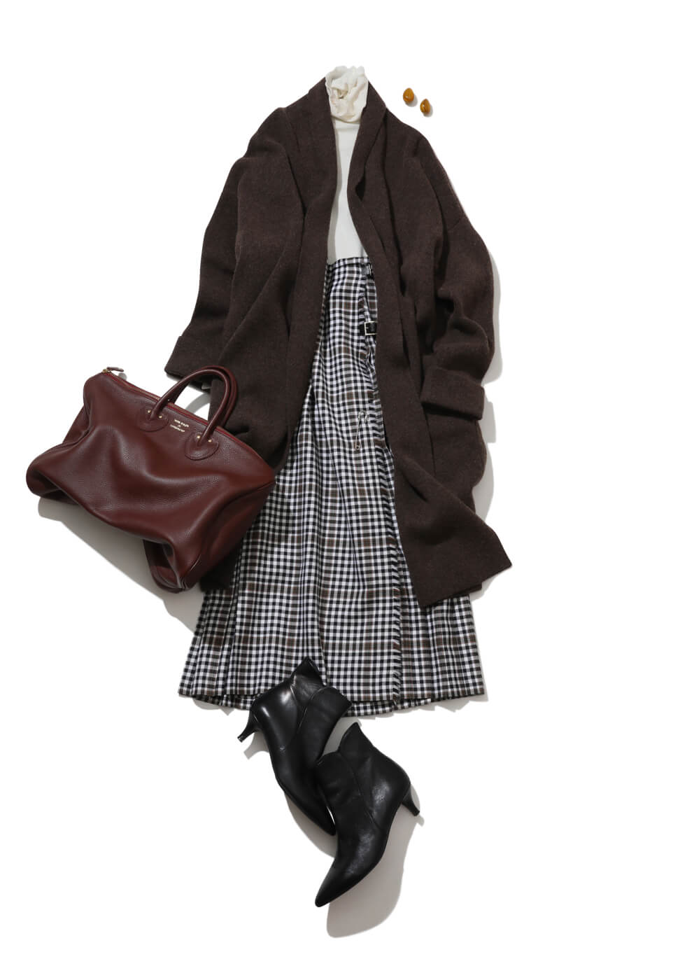 秋の深まりとともに、朝晩の寒暖差の調節が難しい今の時期にはニットガウンを上手に取り入れて。カジュアルダウンの名手にもなるこのアウターをオンに羽織る日は、キレイめにまとめるのをお忘れなく。白のタートルネックニットとチェックのマキシキルトスカートで、知的なレディにまとめたい。華やかなイヤーアクセサリーがワンポイント。