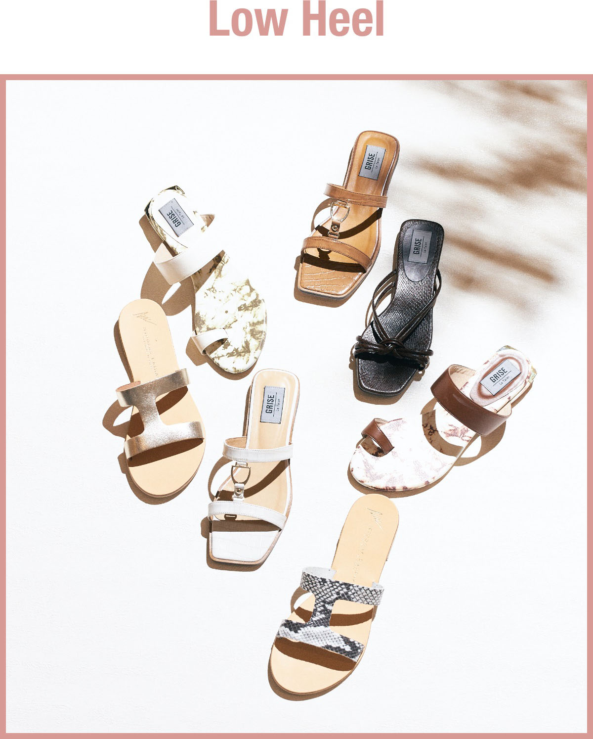 - 女性らしさをたっぷり引き出してくれる、6~7cmの華奢なヒールサンダル。夏らしい素材の太ヒールがアクセントに効いたデザインにも注目。