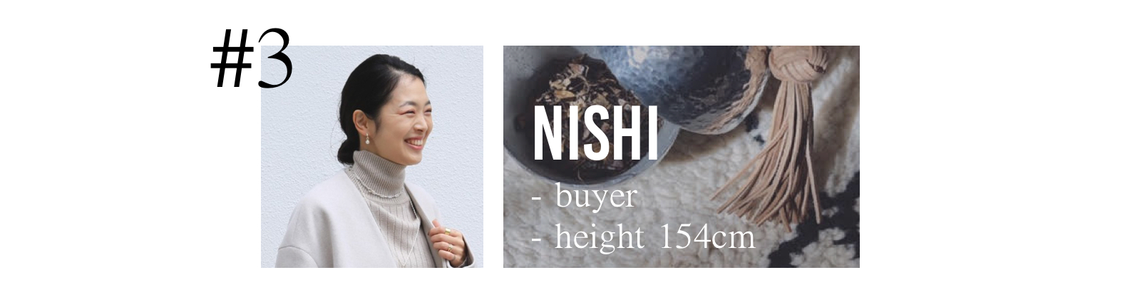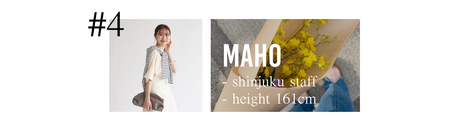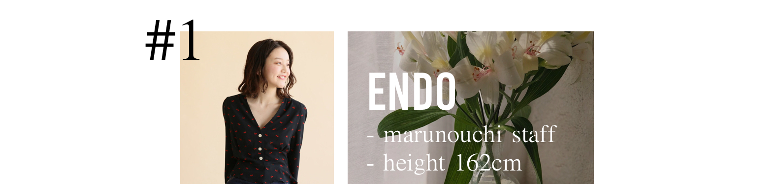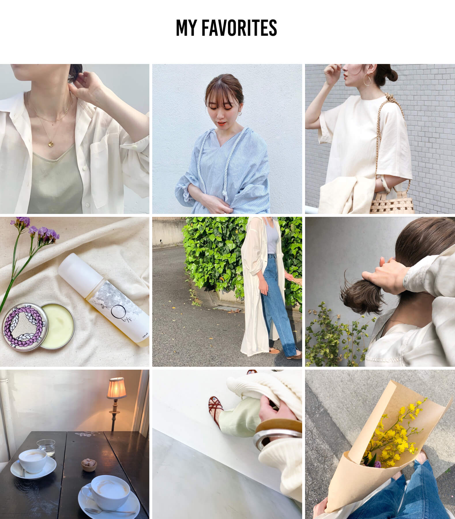 リラックス感のあるカジュアルに、ほんの少し女性らしさをプラスするスタイリングが好きです。日々お洋服やトレンドについて何か新しい素敵な発見はないか探して、スタッフ同士で情報交換をしたりします。メイクやケアについても調べることが好きなので、日頃から色々な方や、SNSから情報を収集するようにしており、素敵だな!気になるな!と思ったものは自身ですぐに試してみます。またカフェ巡り、お花など、自然に触れることは、自身のリラックス出来る大切な趣味です。