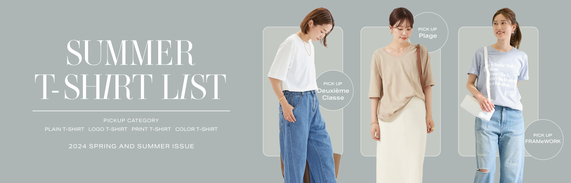 ハーフスリーブの無地Tで旬を演出ワンツーコーデでも野暮ったく見えずトレンドムード感じる無地Tを厳選。Deuxieme Classeのshapely TシャツやPlageのtwist jersey Tシャツが好事例。relumeのフリルリボンTシャツは大人可愛いリボンデザインが華やか。
