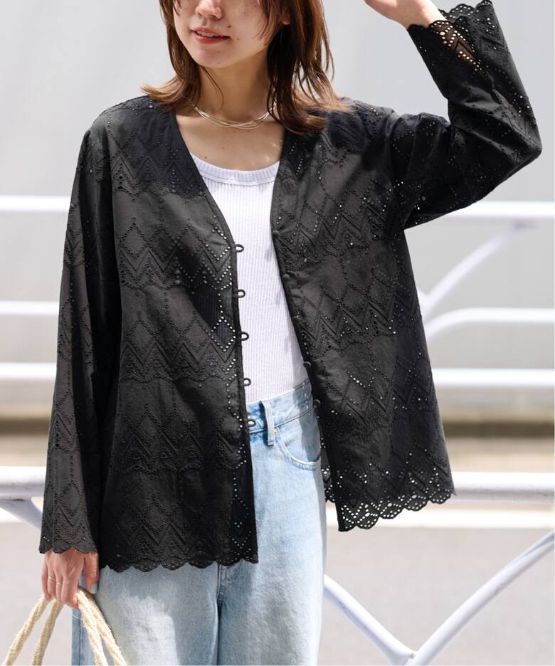 ジャケット感覚だけど軽いブラウス真夏のノースリーブスタイルにさっと羽織りやすいコットンカットワーク刺繍Vネックブラウス。モノトーンながら華やかに映える刺繍柄や、ジャケットのように着られるボクシーなシルエット。夏から秋までの軽羽織としてヘビロテ確実。