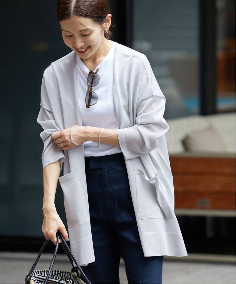 秋カラーに衣替え肌離れの良い素材を使ったさらりとした着心地と、一点投入でこなれるゆるっとしたサイジングが魅力のドライシアーカーディガン。ブラック・グレー・ブラウンという秋カラーのラインナップなのもグッドポイント。