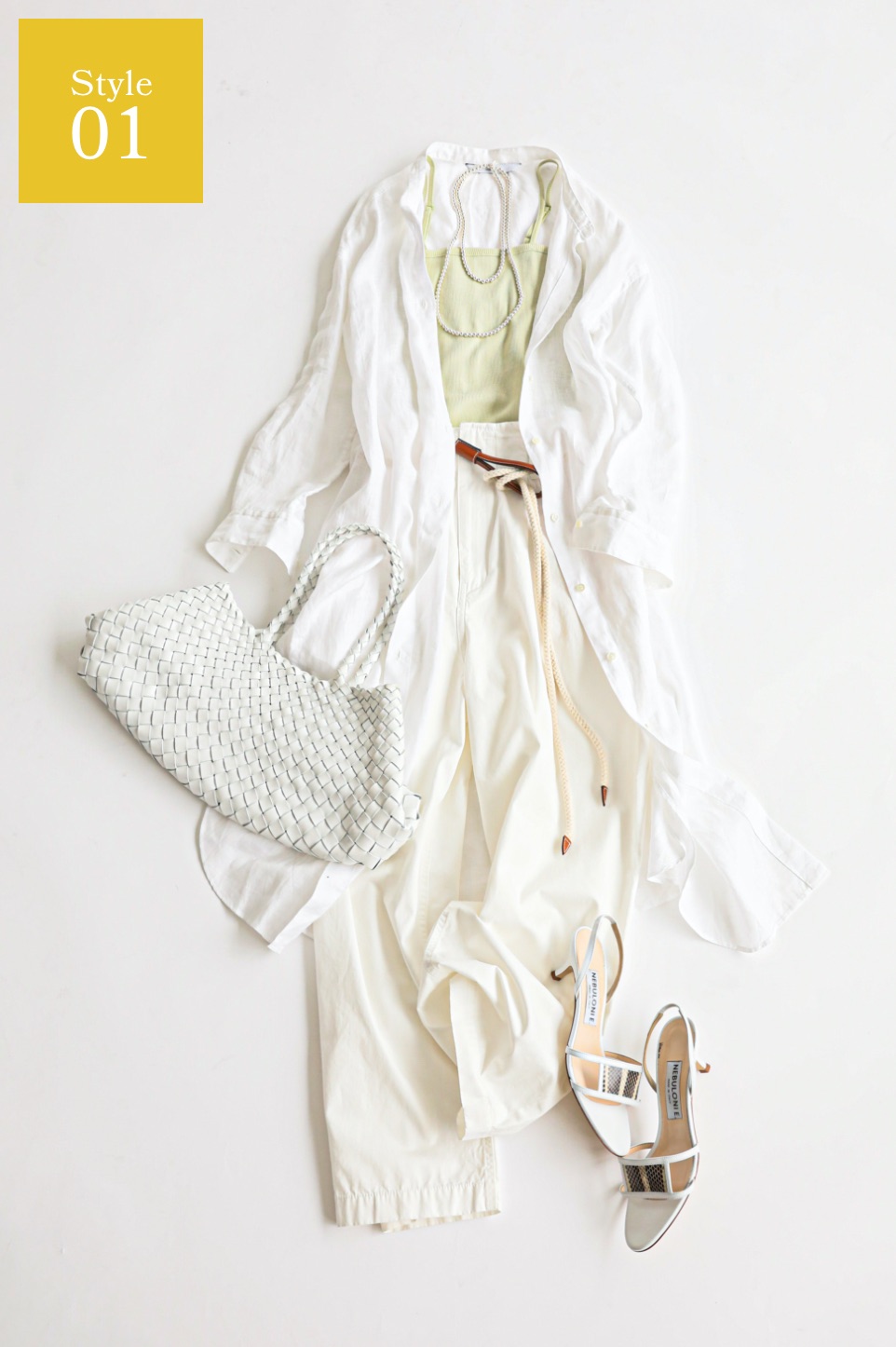 このハイウエストパンツは体のラインを拾いにくく、透けを気にせず履ける素材感が魅力です。ウエストの後ろがゴムになっているので、着心地もラクラク。合わせたリネンのロングシャツやバッグ、サンダルも白で統一し、そこに差し色としてパステルグリーンのキャミをプラスしました。簡単に取り入れられ、即座に着こなしを今年らしく更新できる白+淡い色のグラデーションテク、ぜひお試しあれ。- FRAMeWORKFRENCH LINEN シャツワンピース◆¥18,700(税込)
