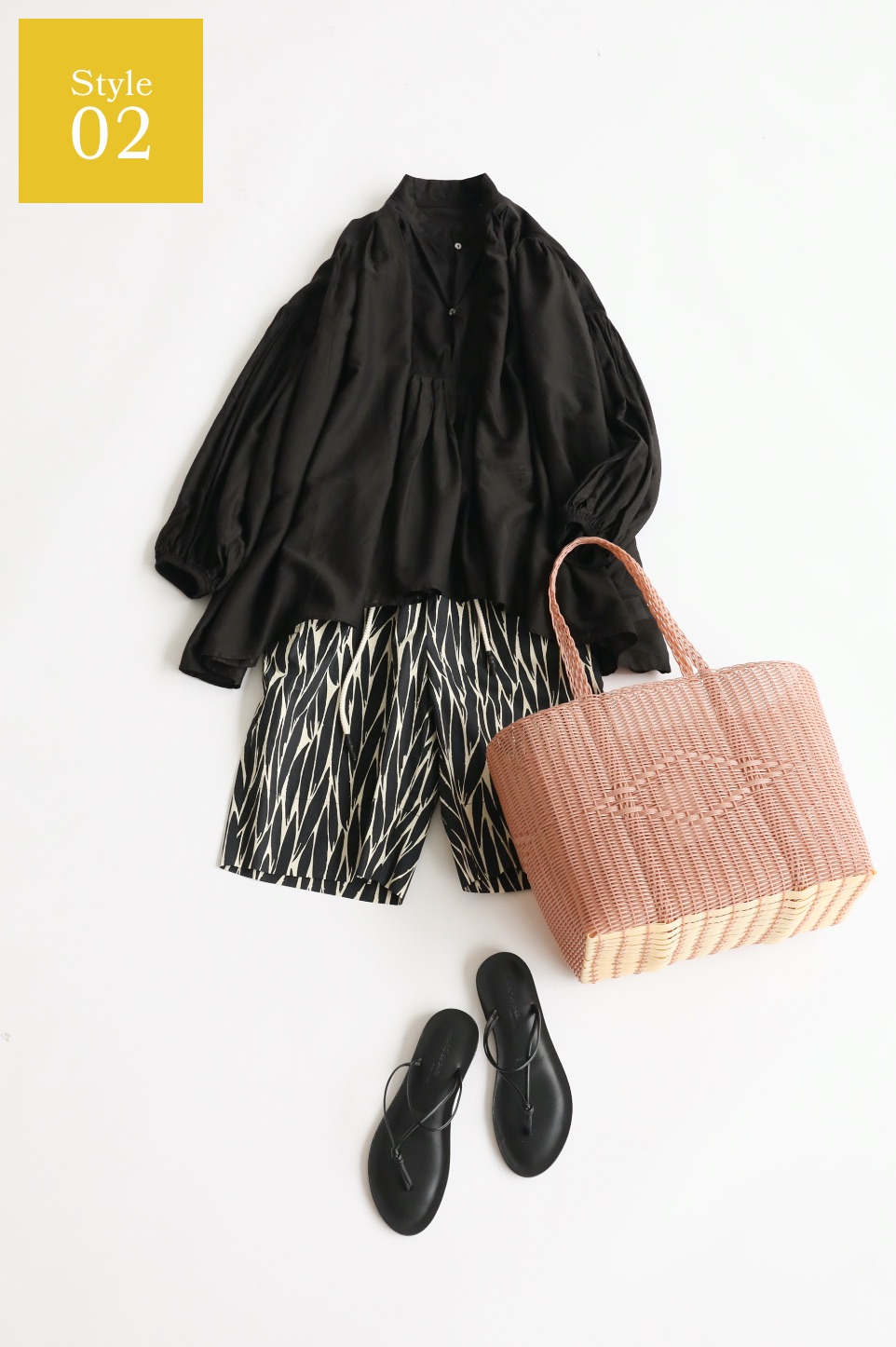 たっぷりのギャザーから生まれる、ふんわりボリューミーなフォルムが目を引くブラウス。ほんのり透け感のある素材で風通しもすごくいいので、黒でも重見えせず、夏も涼しく着られるはずです。合わせるボトムはスキニーパンツでもいいけれど、今年なら断然ショートパンツがおすすめ。全体をモノトーンでまとめれば街でも決して浮かないし、大人が着てこそ、より新鮮に映るバランスだと思います。- FRAMeWORKR/Cボイルタックブラウス◆¥17,600(税込)